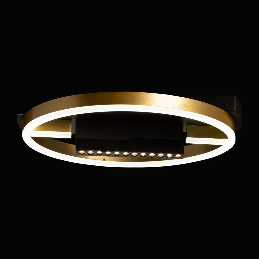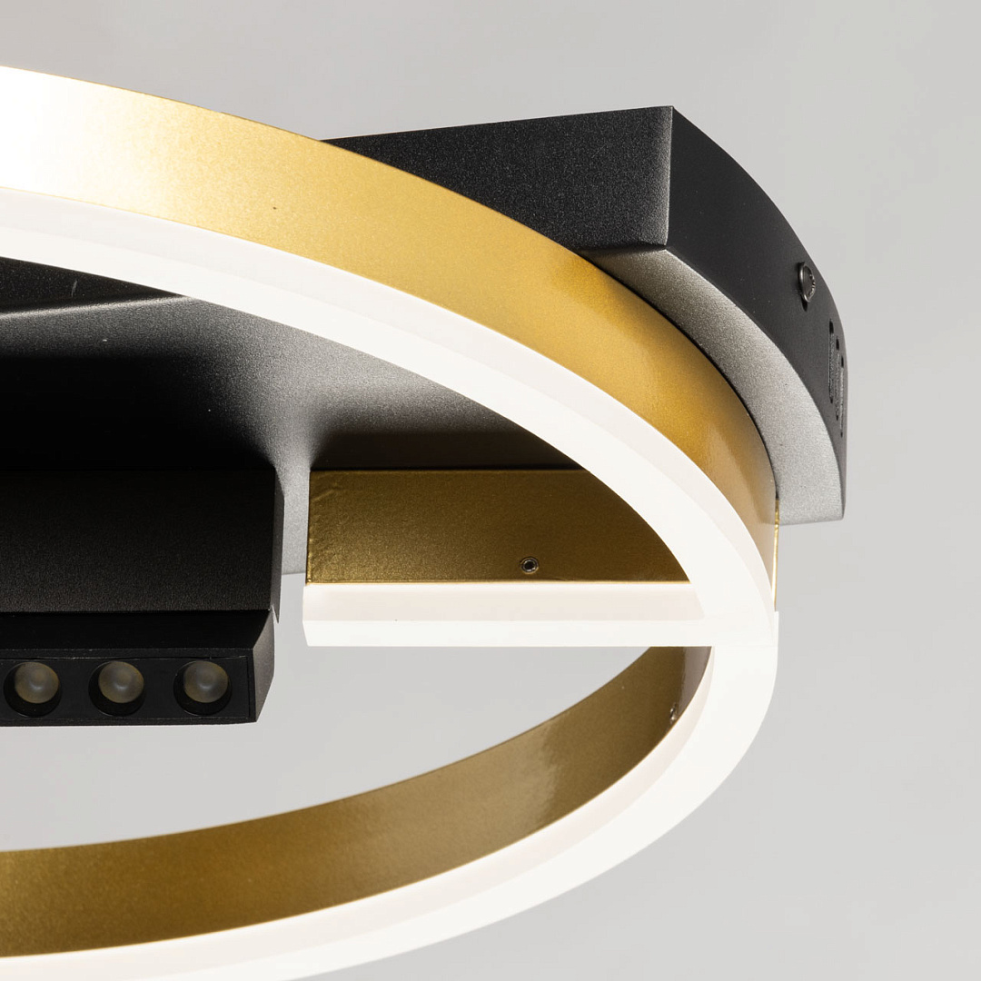 Глубокий черный цвет  в сочетании с золотым цветом  добавляет светильнику концептуальности. Матовый акрил мягко рассеивает свет, создавая комфортное освещение. Многорежимность освещения от 3000К до 6000К позволяет подобрать комфортную температуру света через настенный выключатель. Современный материал плафонов с высокой теплопроводностью эффективно продлевает срок службы светодиодов. Качественные светодиоды экономичны и безопасны. Поворотный функциональный светильник в центре позволяют создать акцентное освещение. Компактный размер потолочной люстры подойдет к интерьерам со стандартным потолком.