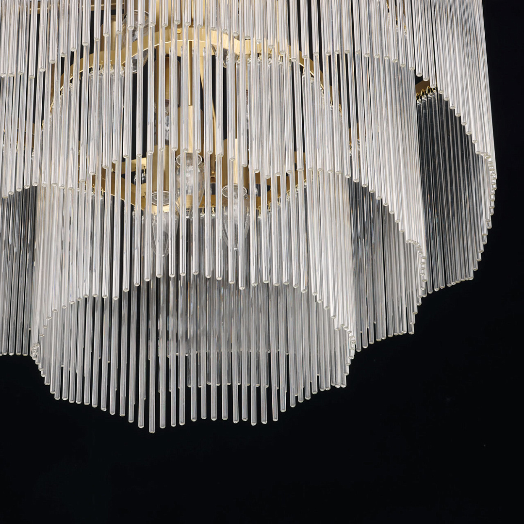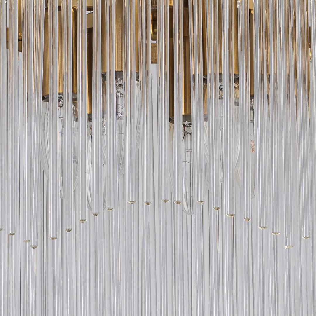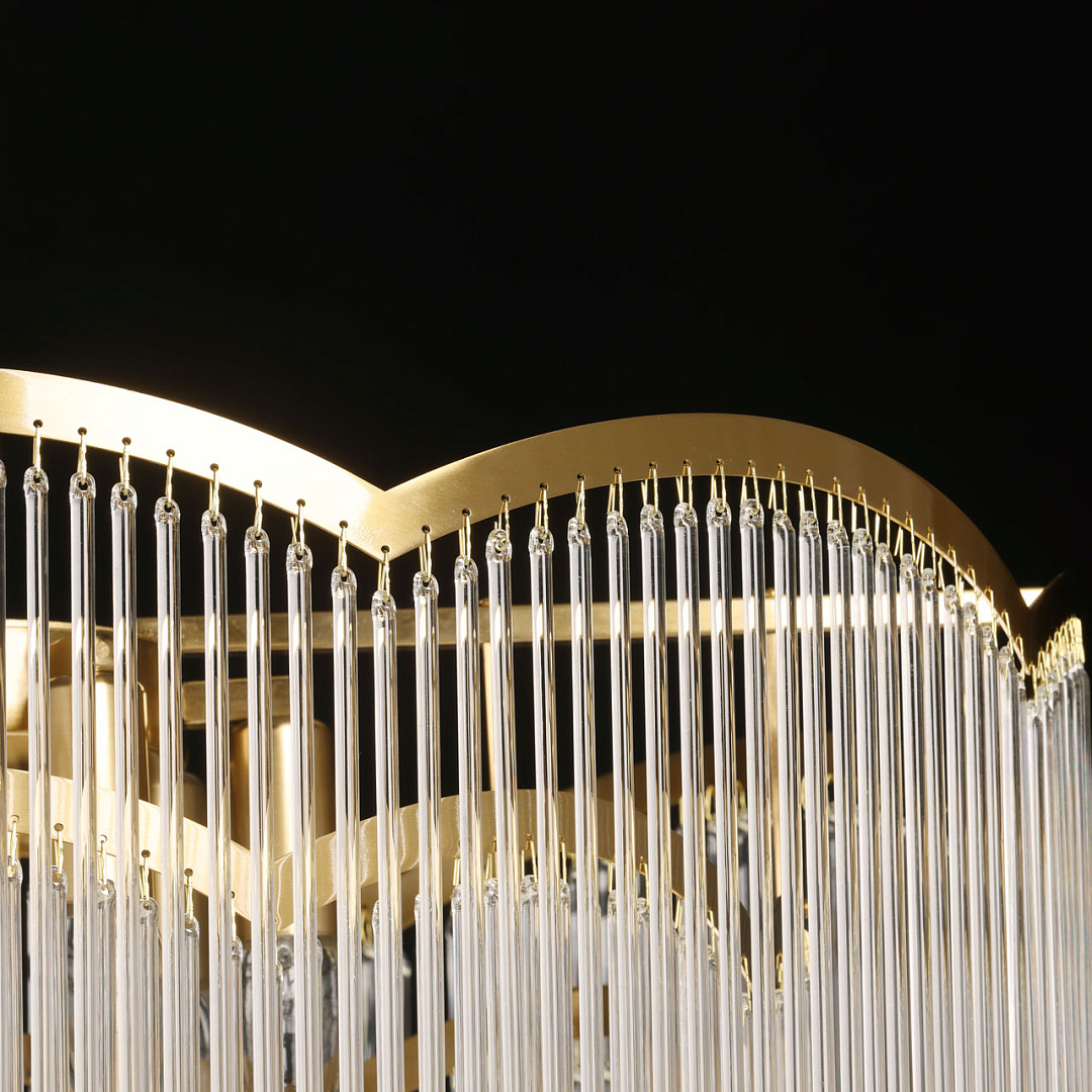 Подвесная люстра представляет собой потрясающий каскад стеклянных трубочек, напоминающих струи воды или льдинки. Воздушный облик подчеркивает металлическое основание насыщенного латунного цвета. Необычный образ  люстры завершается волнистой формой основания в стиле модерн.Заменяемые источники света удобны в эксплуатации.