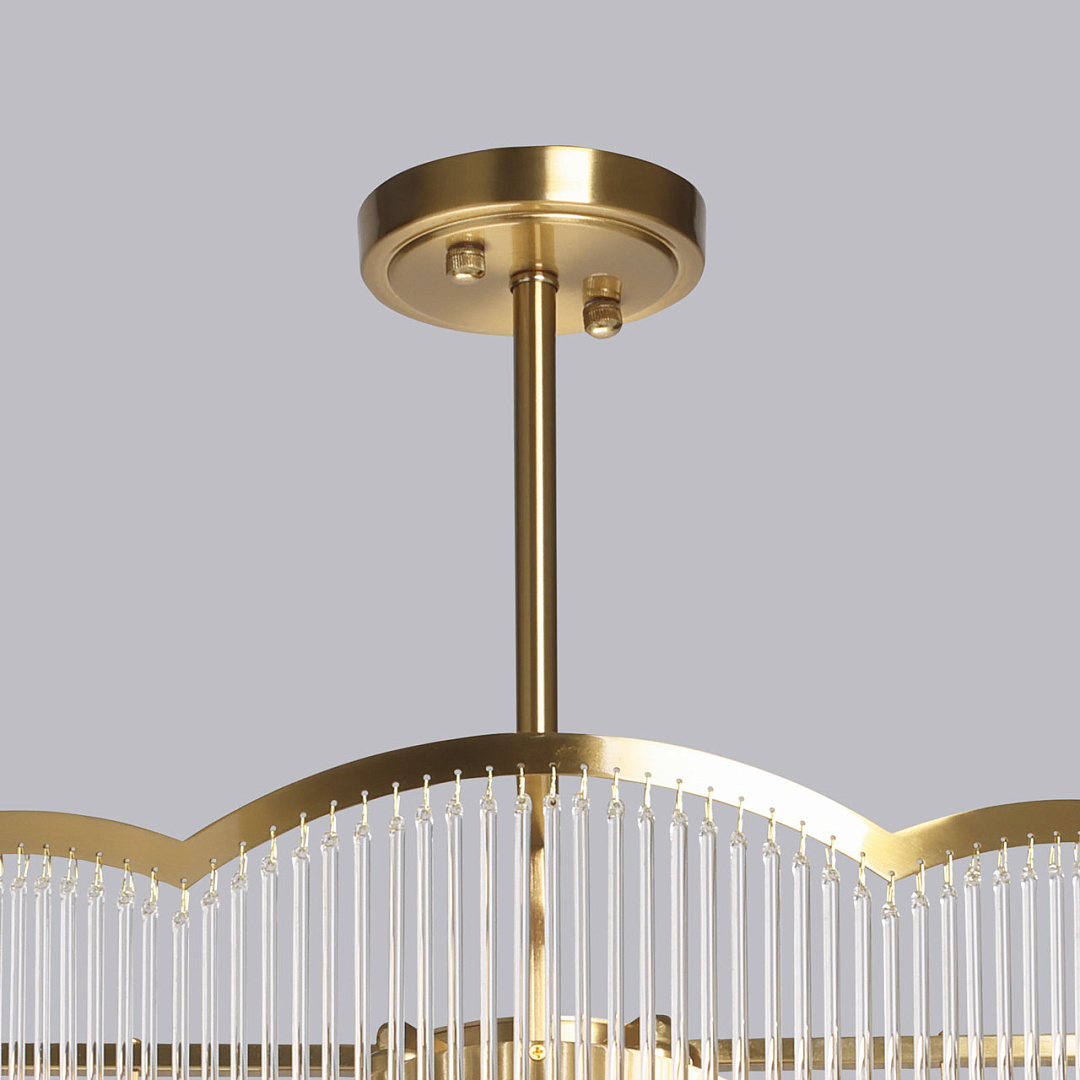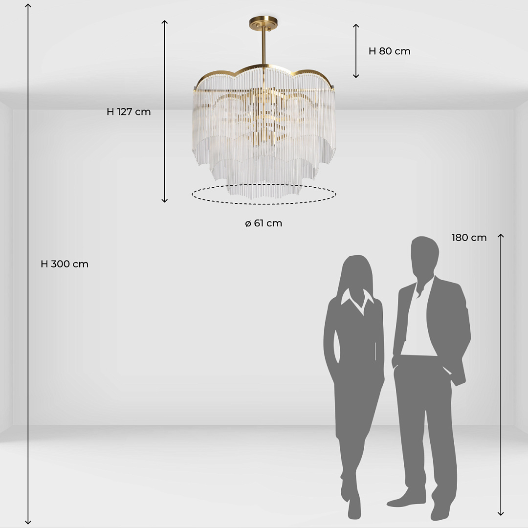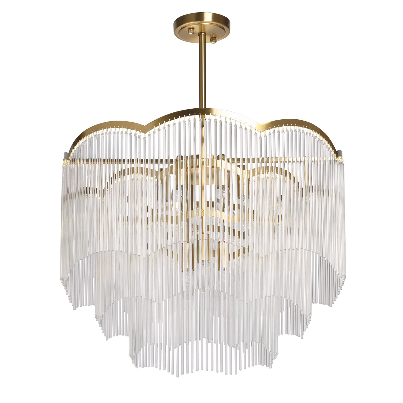 Подвесная люстра представляет собой потрясающий каскад стеклянных трубочек, напоминающих струи воды или льдинки. Воздушный облик подчеркивает металлическое основание насыщенного латунного цвета. Необычный образ  люстры завершается волнистой формой основания в стиле модерн.Заменяемые источники света удобны в эксплуатации.