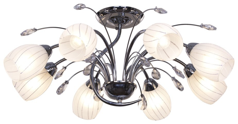 Потолочная люстра 768-107-08 итальянского производителя Velante из коллекции 768 исполнена в стиле модерн. Арматура светильника выполнена из металла цвета хром. Поверхность арматуры глянцевая. Плафон изготовлен из стекла белого цвета. Декоративные элементы выполнены из хрусталя. Осветительный прибор рассчитан на освещение пространства площадью 16 кв. м. Тип цоколя используемых ламп E14. Производитель рекомендует использовать лампы мощностью не более 40 Вт. Суммарная мощность светильника составляет 320 Вт. Лампочки в комплект не входят. Защита от попадания влаги и пыли внутрь изделия не предусмотрена. Рекомендуем к применению в гостиной, спальне.
