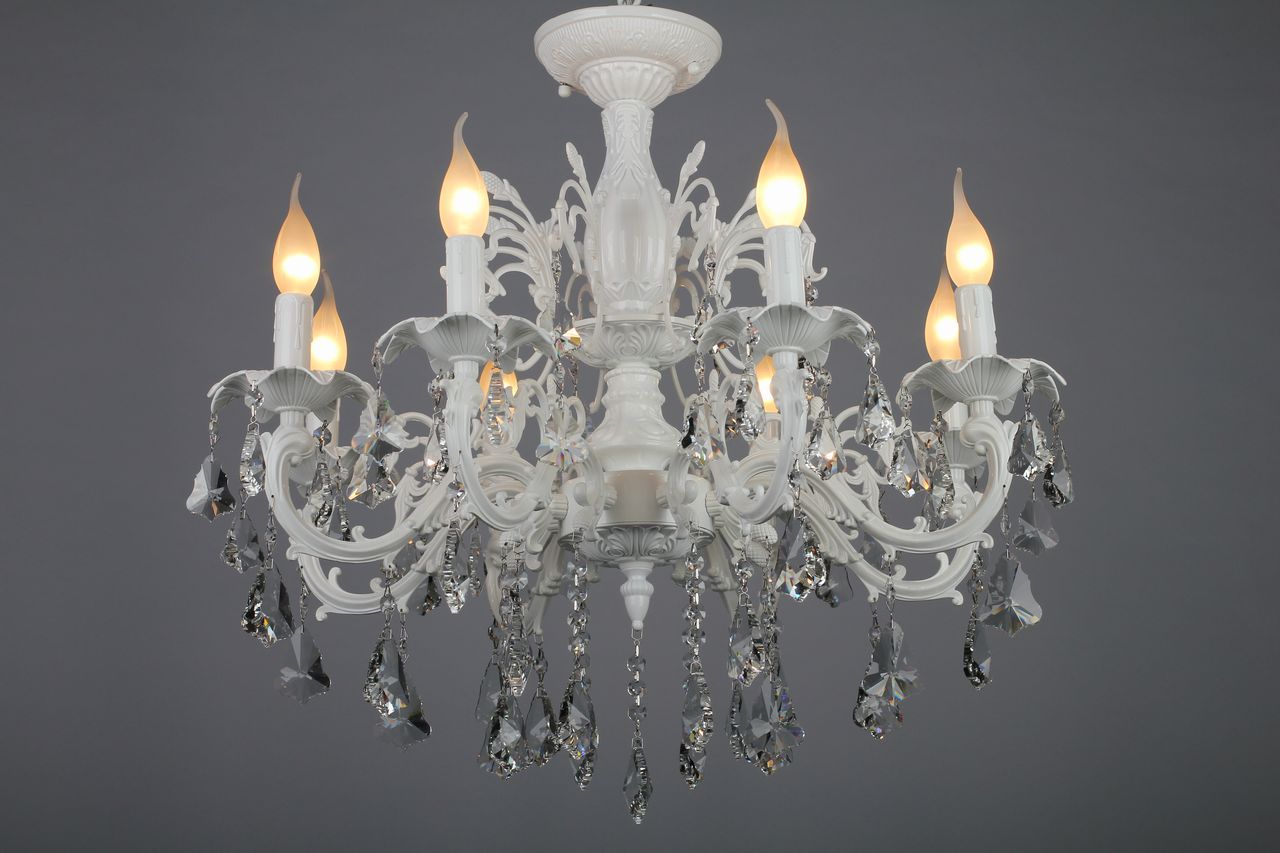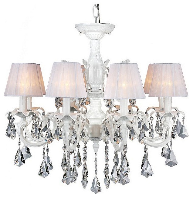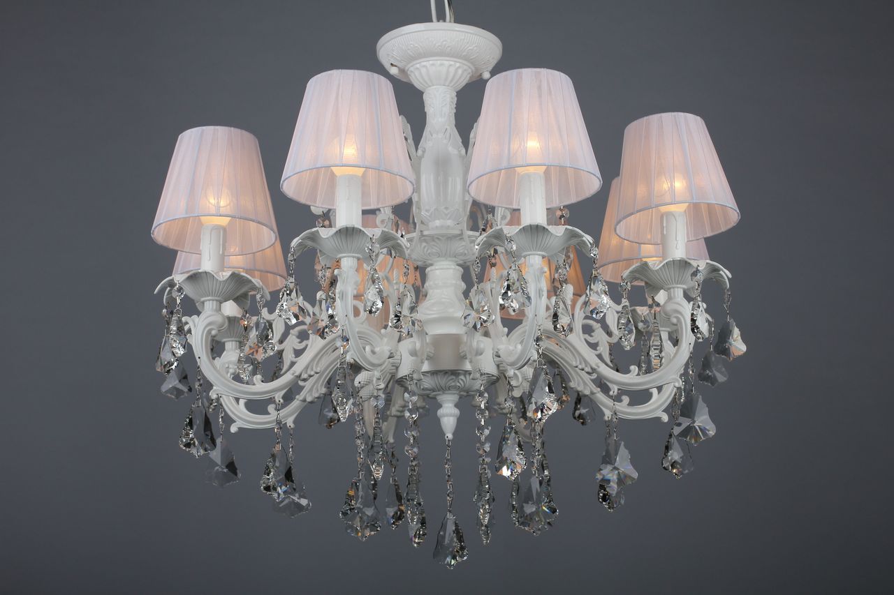 металла белого цвета. Поверхность арматуры глянцевая и рельефная. Плафон отсутствует. Осветительный прибор рассчитан на освещение пространства площадью 16 кв. м. Тип цоколя используемых ламп E14. Производитель рекомендует использовать лампы мощностью не более 40 Вт. Суммарная мощность светильника составляет 320 Вт. Лампочки в комплект не входят. Защита от попадания влаги и пыли внутрь изделия не предусмотрена. Рекомендуем к применению в гостиной, кабинете, спальне.