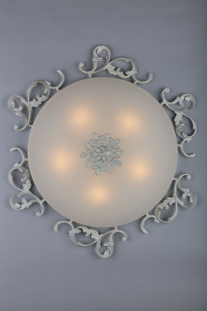 металла белого и золотого цветов. Поверхность арматуры глянцевая и рельефная. Плафон изготовлен из стекла белого цвета, имеет форму полусферы и матовую поверхность. Направлен вниз. Осветительный прибор рассчитан на освещение пространства площадью 10 кв. м. Тип цоколя используемых ламп E14. Производитель рекомендует использовать лампы мощностью не более 40 Вт. Суммарная мощность светильника составляет 200 Вт. Лампочки в комплект не входят. Защита от попадания влаги и пыли внутрь изделия не предусмотрена. Рекомендуем к применению в гостиной, кабинете, прихожей, спальне.