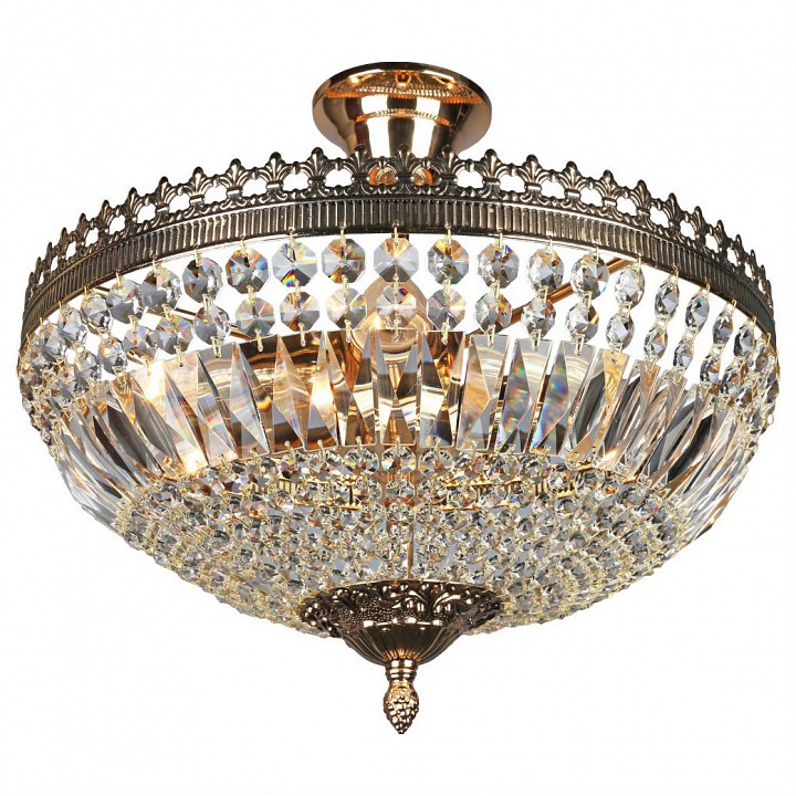 металла золотого цвета. Поверхность арматуры глянцевая. Плафон изготовлен из хрусталя прозрачного цвета. Декоративные элементы выполнены из прозрачного хрусталя. Осветительный прибор рассчитан на освещение пространства площадью 8 кв. м. Тип цоколя используемых ламп E27. Производитель рекомендует использовать лампы мощностью не более 40 Вт. Суммарная мощность светильника составляет 160 Вт. Лампочки в комплект не входят. Защита от попадания влаги и пыли внутрь изделия не предусмотрена. Рекомендуем к применению в гостиной, спальне, прихожей, кабинете.