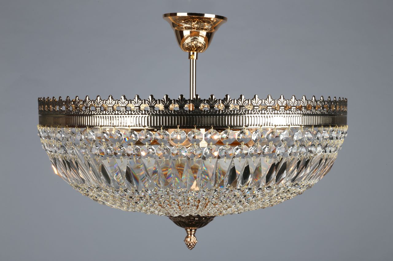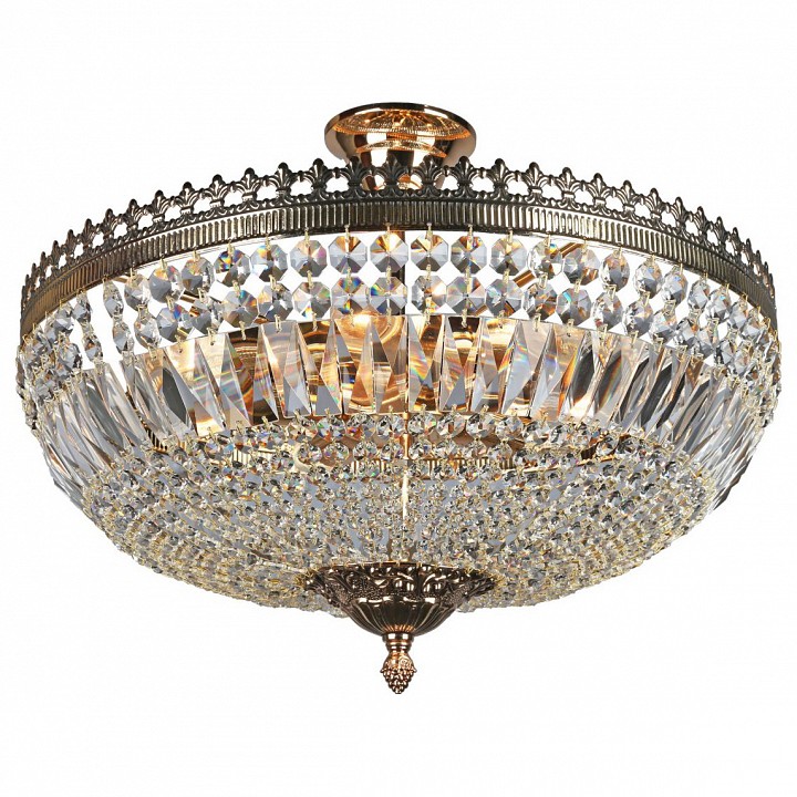 металла золотого цвета. Поверхность арматуры глянцевая. Плафон изготовлен из хрусталя прозрачного цвета. Декоративные элементы выполнены из прозрачного хрусталя. Осветительный прибор рассчитан на освещение пространства площадью 10 кв. м. Тип цоколя используемых ламп E27. Производитель рекомендует использовать лампы мощностью не более 40 Вт. Суммарная мощность светильника составляет 200 Вт. Лампочки в комплект не входят. Защита от попадания влаги и пыли внутрь изделия не предусмотрена. Рекомендуем к применению в гостиной, спальне, прихожей, кабинете.