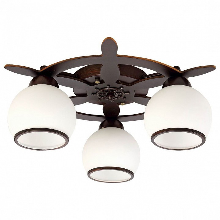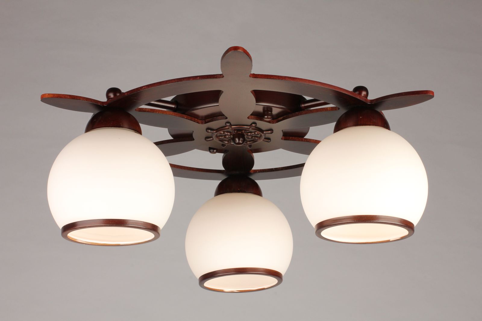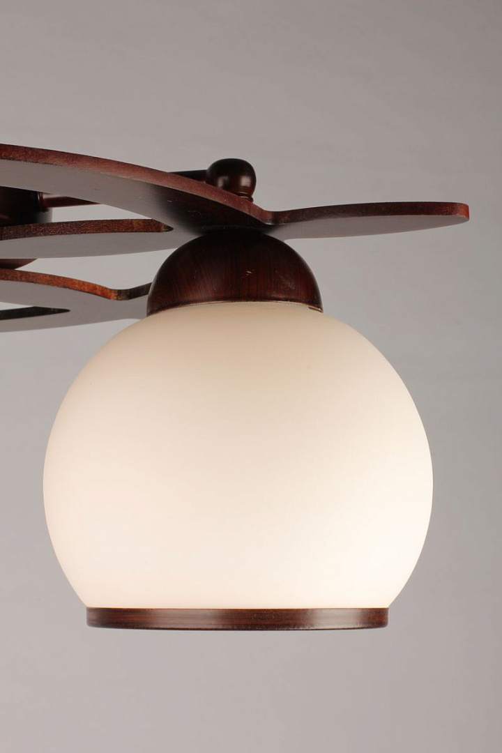 металла и дерева цвета красное дерево. Поверхность арматуры матовая. Плафон изготовлен из стекла белого цвета, имеет сферическую форму и матовую поверхность. Направлен вниз. Осветительный прибор рассчитан на освещение пространства площадью 9 кв. м. Тип цоколя используемых ламп E27. Производитель рекомендует использовать лампы мощностью не более 60 Вт. Суммарная мощность светильника составляет 180 Вт. Лампочки в комплект не входят. Защита от попадания влаги и пыли внутрь изделия не предусмотрена. Рекомендуем к применению в гостиной, кабинете, спальне.