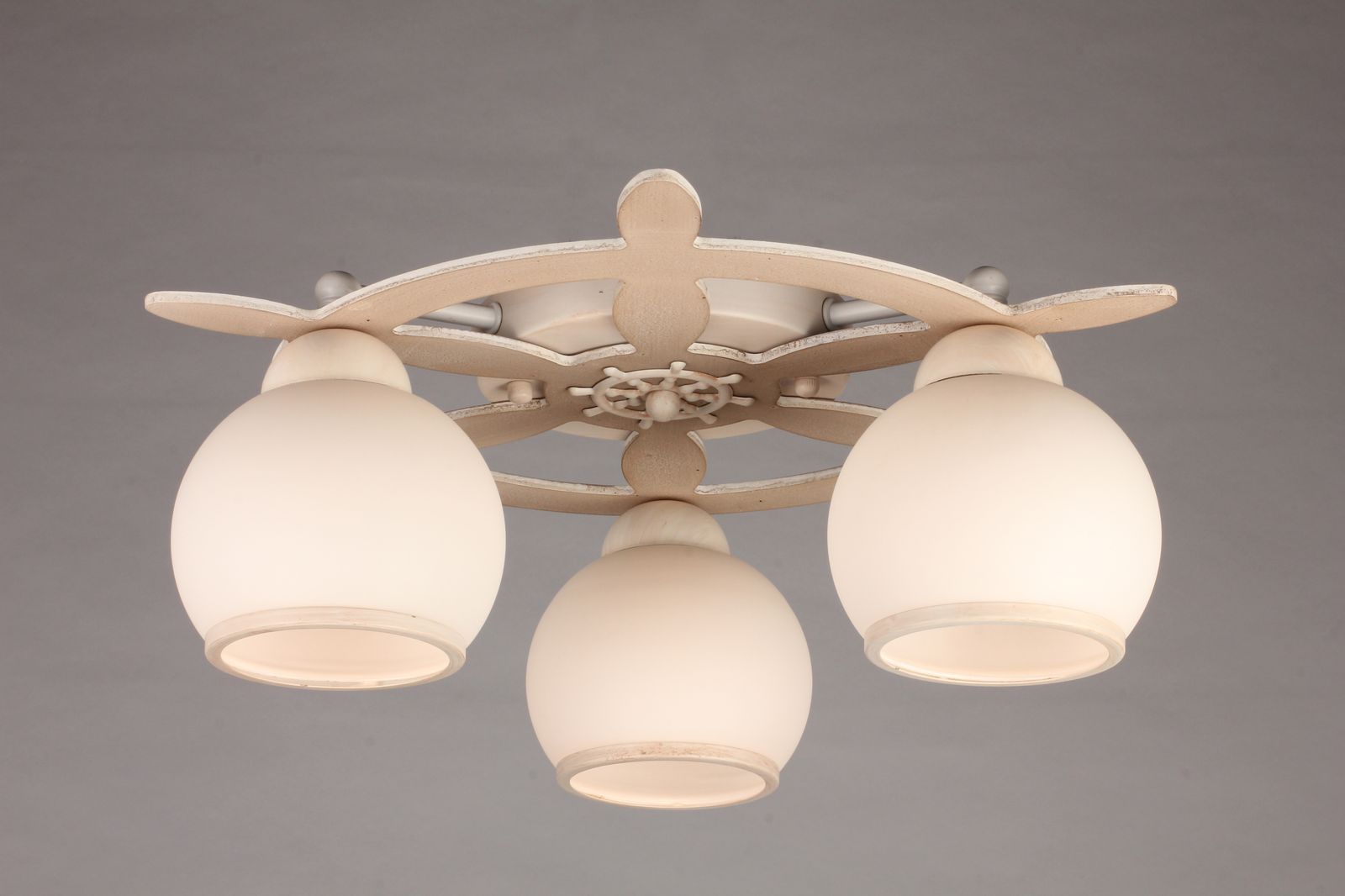 металла и дерева цвета белое дерево. Поверхность арматуры матовая. Плафон изготовлен из стекла белого цвета, имеет сферическую форму и матовую поверхность. Направлен вниз. Осветительный прибор рассчитан на освещение пространства площадью 9 кв. м. Тип цоколя используемых ламп E27. Производитель рекомендует использовать лампы мощностью не более 60 Вт. Суммарная мощность светильника составляет 180 Вт. Лампочки в комплект не входят. Защита от попадания влаги и пыли внутрь изделия не предусмотрена. Рекомендуем к применению в гостиной, кабинете, спальне.