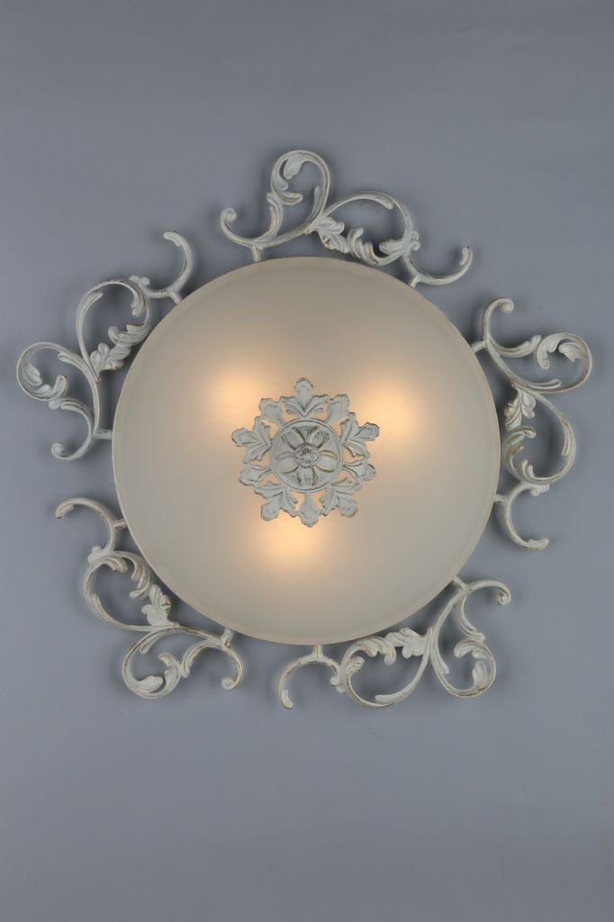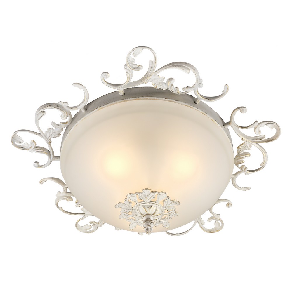 металла белого и золотого цветов. Поверхность арматуры глянцевая и рельефная. Плафон изготовлен из стекла белого цвета, имеет форму полусферы и матовую поверхность. Направлен вниз. Осветительный прибор рассчитан на освещение пространства площадью 6 кв. м. Тип цоколя используемых ламп E14. Производитель рекомендует использовать лампы мощностью не более 40 Вт. Суммарная мощность светильника составляет 120 Вт. Лампочки в комплект не входят. Защита от попадания влаги и пыли внутрь изделия не предусмотрена. Рекомендуем к применению в гостиной, кабинете, прихожей, спальне.
