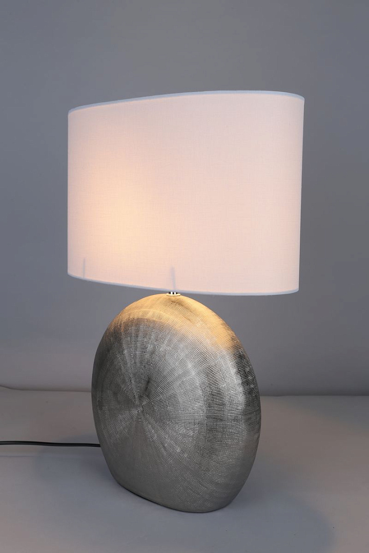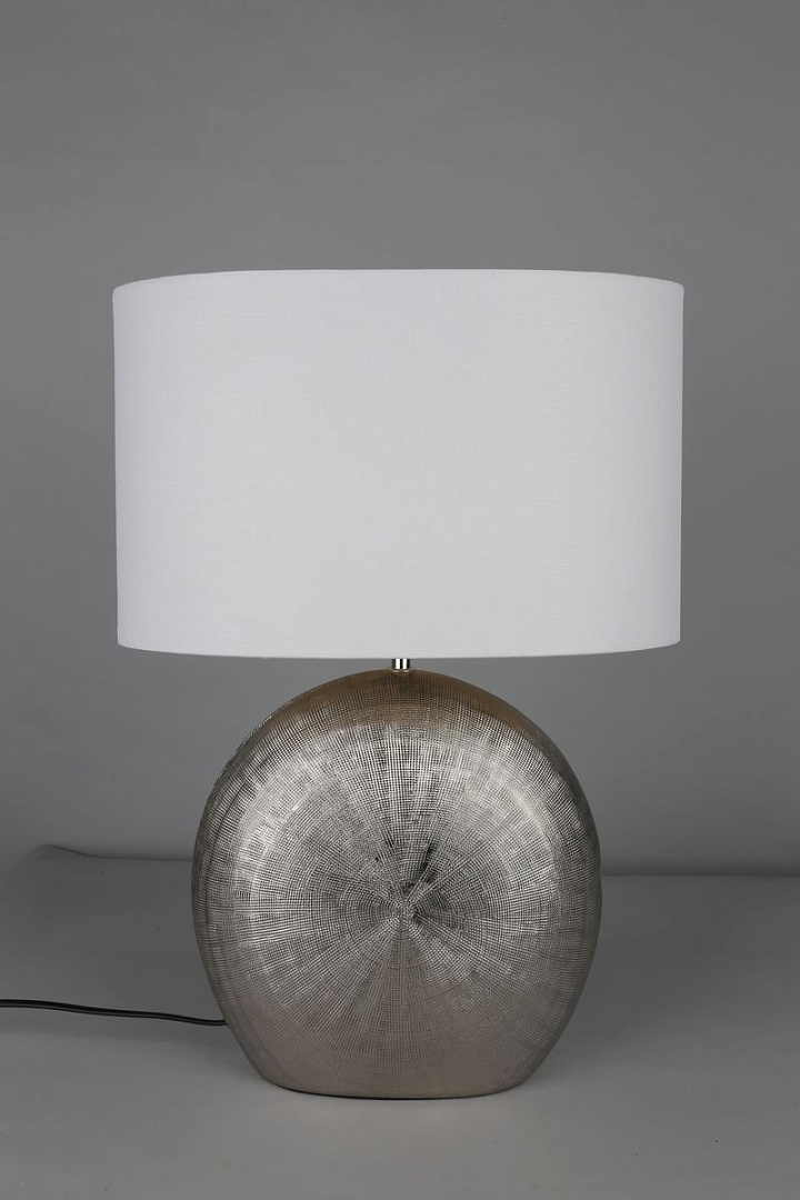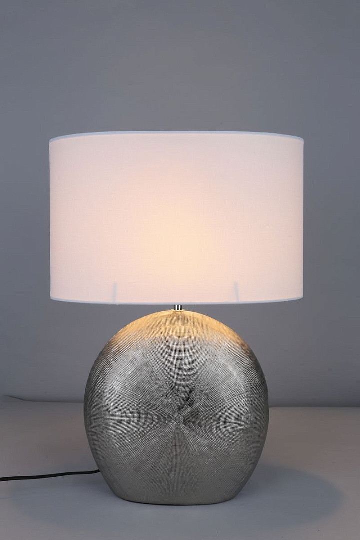 металла серебристого цвета. Поверхность арматуры матовая. Плафон изготовлен из текстиля белого цвета, имеет цилиндрическую форму и матовую поверхность. Направлен вверх и вниз. Осветительный прибор рассчитан на освещение пространства площадью 3 кв. м. Тип цоколя используемых ламп E27. Производитель рекомендует использовать лампы мощностью не более 60 Вт. Суммарная мощность светильника составляет 60 Вт. Лампочки в комплект не входят. Защита от попадания влаги и пыли внутрь изделия не предусмотрена. Имеется выключатель на проводе. Рекомендуем к применению в гостиной, кабинете, спальне.