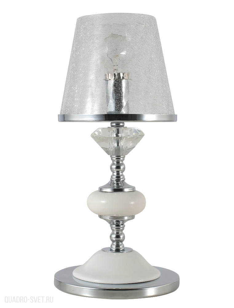 металла цвета хром. Поверхность арматуры глянцевая. Плафон изготовлен из стекла прозрачный цвета с эффектом кракле. Декоративные элементы выполнены из керамики. Осветительный прибор рассчитан на освещение пространства площадью 3 кв. м. Тип цоколя используемых ламп E14. Производитель рекомендует использовать лампы мощностью не более 60 Вт. Суммарная мощность светильника составляет 60 Вт. Лампочки в комплект не входят. Защита от попадания влаги и пыли внутрь изделия не предусмотрена. Рекомендуем к применению в спальне, гостиной, кабинете.