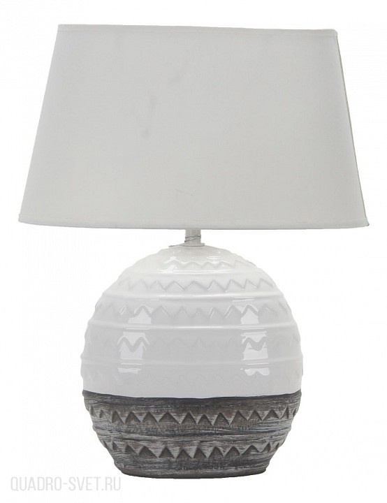 керамики белого и серого цветов. Поверхность арматуры матовая, рельефная. Плафон изготовлен из текстиля белого цвета, имеет конусную форму и матовую поверхность. Направлен вверх и вниз. Осветительный прибор рассчитан на освещение пространства площадью 3 кв. м. Тип цоколя используемых ламп E27. Производитель рекомендует использовать лампы мощностью не более 60 Вт. Суммарная мощность светильника составляет 60 Вт. Лампочки в комплект не входят. Защита от попадания влаги и пыли внутрь изделия не предусмотрена. Имеется выключатель на проводе. Рекомендуем к применению в гостиной, кабинете, спальне.