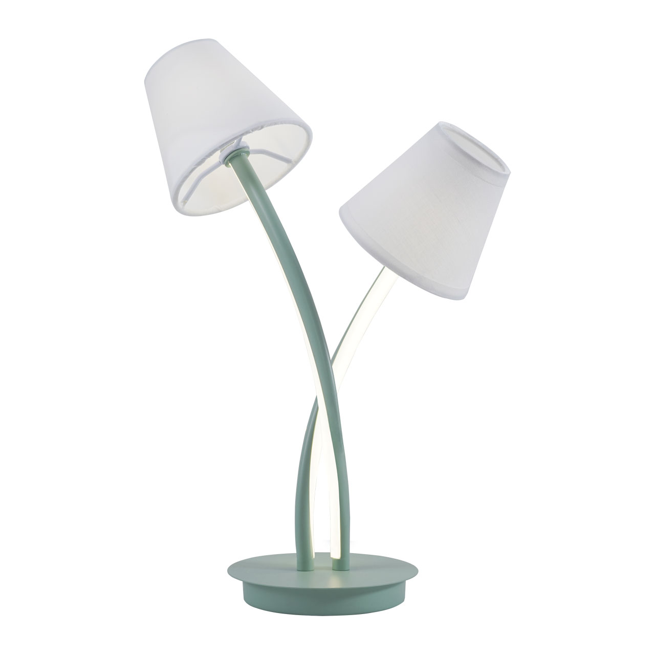 Зеленый цвет основания эффектно выделяет настольную лампу, делая ее интересным акцентом в интерьере. Изящно изогнутые плафоны придают настольному светильнику оригинальность. Белый силикон плафонов мягко рассеивают свет. Эффектной изюминкой лампы является возможность комбинировать современное светодиодное освещение и классические текстильные абажуры. Благодаря стильному дизайну и высокому качеству, этот светильник станет прекрасным дополнением к любому интерьеру, принося в него индивидуальность и яркость. Светодиодные источники света экономичны и безопасны.