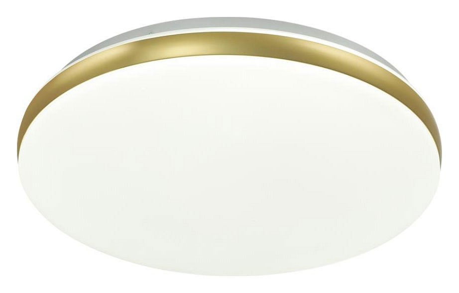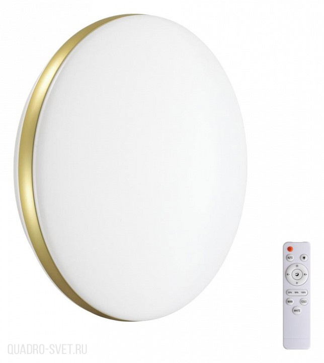 Светильник 7626/EL линии RINGO состоит из металлического основания (базы) и пластикового рассеивателя. Материал рассеивателя - высококачественный пластик марки PMMA 2.0 белого цвета с матовой поверхностью, без текстуры. Пластик обеспечивает светильнику равномерное рассеивание и хорошее светопропускание. Форма плафона: круглая, декорирована ободом из пластика золотистого цвета. Степень защиты IP43 позволяет использовать светильник в определенных зонах влажных помещений. В комплект входит заменяемый LED модуль с линзами, мощностью 72Вт, которая соответствует лампе накаливания 520Вт. А также пульт ДУ, с помощью которого осуществляется плавное изменение цветовой температуры 3000-6000К, изменение яркости, переход в режим переключения теплого/белого/холодного/ночного света. Светильник имеет функцию "память".