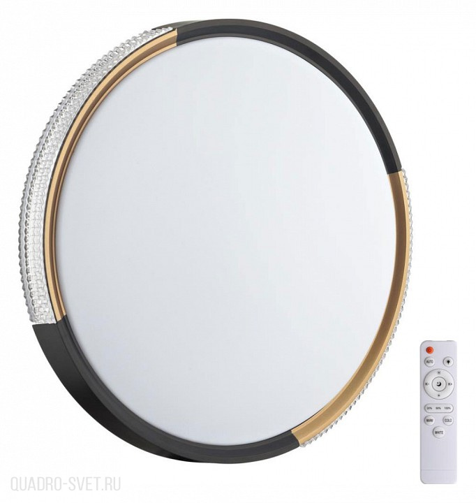 Светильник 7629/DL линии VELIO состоит из металлического основания (базы) и пластикового рассеивателя. Материал рассеивателя - качественный акрил белого цвета с матовой поверхностью, без текстуры. Пластик обеспечивает светильнику равномерное рассеивание и хорошее светопропускание. Форма плафона: круглая, декорирована ободом из пластика "под хрусталь" с черным и золотистым элементами декора. Степень защиты IP43 позволяет использовать светильник в определенных зонах влажных помещений. В комплект входит заменяемый LED модуль с линзами, мощностью 48Вт, которая соответствует лампе накаливания 350Вт. А также пульт ДУ, с помощью которого осуществляется плавное изменение цветовой температуры 3000-6000К, изменение яркости, переход в режим переключения теплого/белого/холодного/ночного света. Светильник имеет функцию "память".