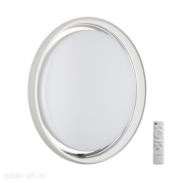 Светильник 7697/DL линии HANI состоит из металлического основания (базы) и пластикового рассеивателя. Материал рассеивателя - высококачественный пластик марки PMMA 2.0 белого цвета с глянцевой поверхностью, без текстуры. Пластик обеспечивает светильнику равномерное рассеивание и хорошее светопропускание. Форма плафона: круглая, декорирована многослойным ободом из пластика белого цвета у края плафона и прозрачного цвета у его основания. Степень защиты IP43 позволяет использовать светильник в определенных зонах влажных помещений. В комплект входит заменяемый LED модуль с линзами, мощностью 48Вт, которая соответствует лампе накаливания 440Вт. А также пульт ДУ (с креплением на стену), с помощью которого осуществляется плавное изменение цветовой температуры 3000-6000К, изменение яркости, переход в режим переключения теплого/белого/холодного/ночного света. Светильник имеет функцию "память".