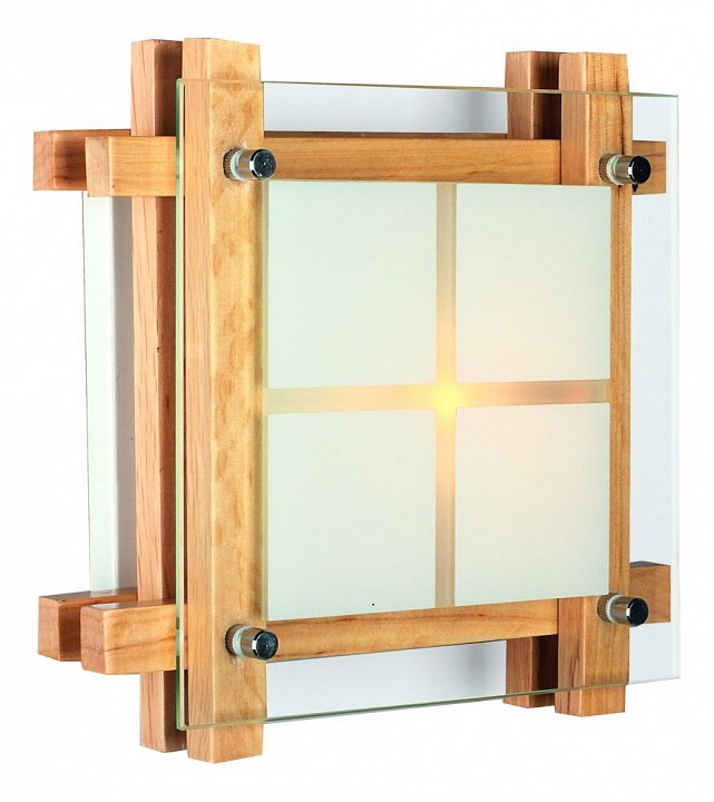 металла и дерева цвета сосна. Поверхность арматуры матовая. Плафон изготовлен из стекла белого и прозрачного цветов, имеет квадратную плоскую форму и матовую поверхность. Направлен вперед. Осветительный прибор рассчитан на освещение пространства площадью 2 кв. м. Тип цоколя используемых ламп E14. Производитель рекомендует использовать лампы мощностью не более 40 Вт. Суммарная мощность светильника составляет 40 Вт. Лампочки в комплект не входят. Защита от попадания влаги и пыли внутрь изделия не предусмотрена. Рекомендуем к применению в гостиной, кабинетее, коридорее, прихожей, спальне.
