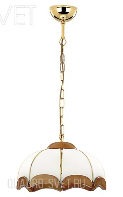 металла и дерева цветов золото и дуб. Поверхность арматуры матовая. Плафон изготовлен из стекла белого цвета, имеет конусную форму и матовую поверхность. Направлен вверх. Осветительный прибор рассчитан на освещение пространства площадью 5 кв. м. Тип цоколя используемых ламп E27. Производитель рекомендует использовать лампы мощностью не более 60 Вт. Суммарная мощность светильника составляет 60 Вт. Лампочки в комплект не входят. Защита от попадания влаги и пыли внутрь изделия не предусмотрена. Рекомендуем к применению в кухне, коридоре, спальне, гостиной.