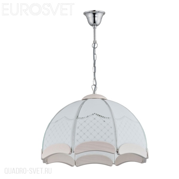 металла и дерева цветов хром и бежевый. Поверхность арматуры матовая. Плафон изготовлен из стекла белого цвета, имеет форму полусферы и матовую поверхность. Направлен вниз. Осветительный прибор рассчитан на освещение пространства площадью 14 кв. м. Тип цоколя используемых ламп E27. Производитель рекомендует использовать лампы мощностью не более 60 Вт. Суммарная мощность светильника составляет 180 Вт. Лампочки в комплект не входят. Защита от попадания влаги и пыли внутрь изделия не предусмотрена. Рекомендуем к применению в гостиной, кабинете, прихожей, спальне.