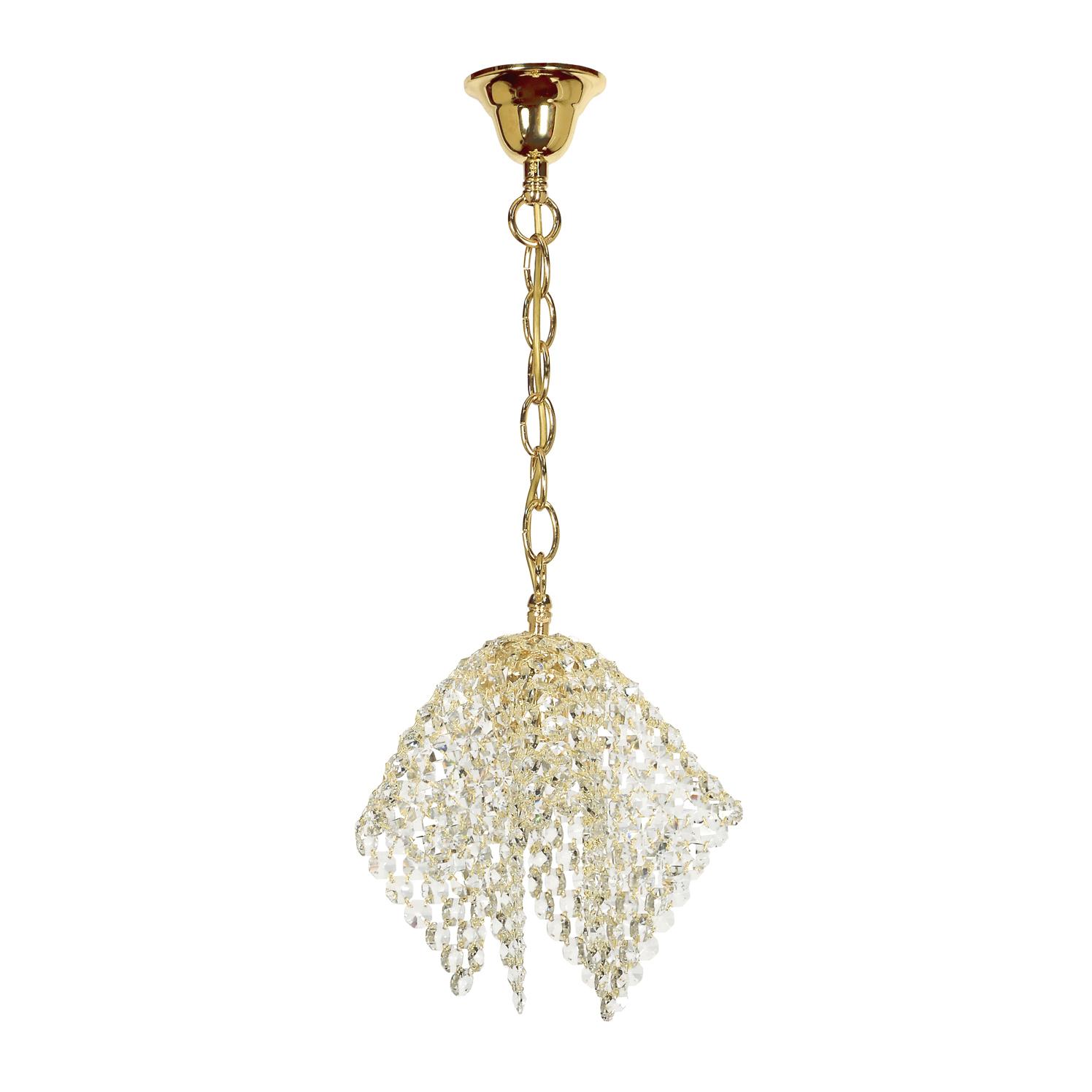 металла золотого цвета. Поверхность арматуры глянцевая. Плафон изготовлен из хрусталя прозрачного цвета, имеет сложную форму и прозрачную поверхность. Направлен вниз. Декоративные элементы выполнены из прозрачного хрусталя. Осветительный прибор рассчитан на освещение пространства площадью 3 кв. м. Тип цоколя используемых ламп E27. Производитель рекомендует использовать лампы мощностью не более 60 Вт. Суммарная мощность светильника составляет 60 Вт. Лампочки в комплект не входят. Защита от попадания влаги и пыли внутрь изделия не предусмотрена. Рекомендуем к применению в гостиной, кабинете, прихожей, спальне.