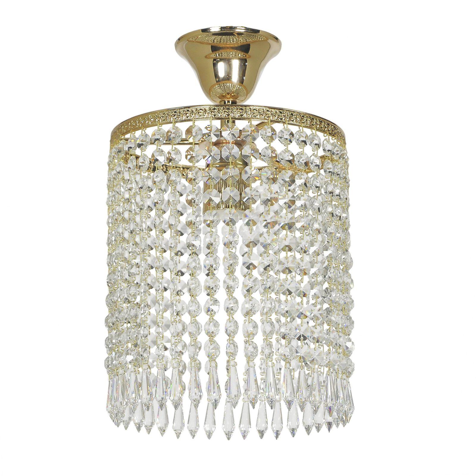 латуни золотого цвета. Поверхность арматуры глянцевая. Плафон изготовлен из хрусталя прозрачного цвета. с глянцевой поверхностью. Декоративные элементы выполнены из прозрачного хрусталя. Осветительный прибор рассчитан на освещение пространства площадью 3 кв. м. Тип цоколя используемых ламп E27. Производитель рекомендует использовать лампы мощностью не более 60 Вт. Суммарная мощность светильника составляет 60 Вт. Лампочки в комплект не входят. Защита от попадания влаги и пыли внутрь изделия не предусмотрена. Рекомендуем к применению в гостиной, кабинете, прихожей, спальне.