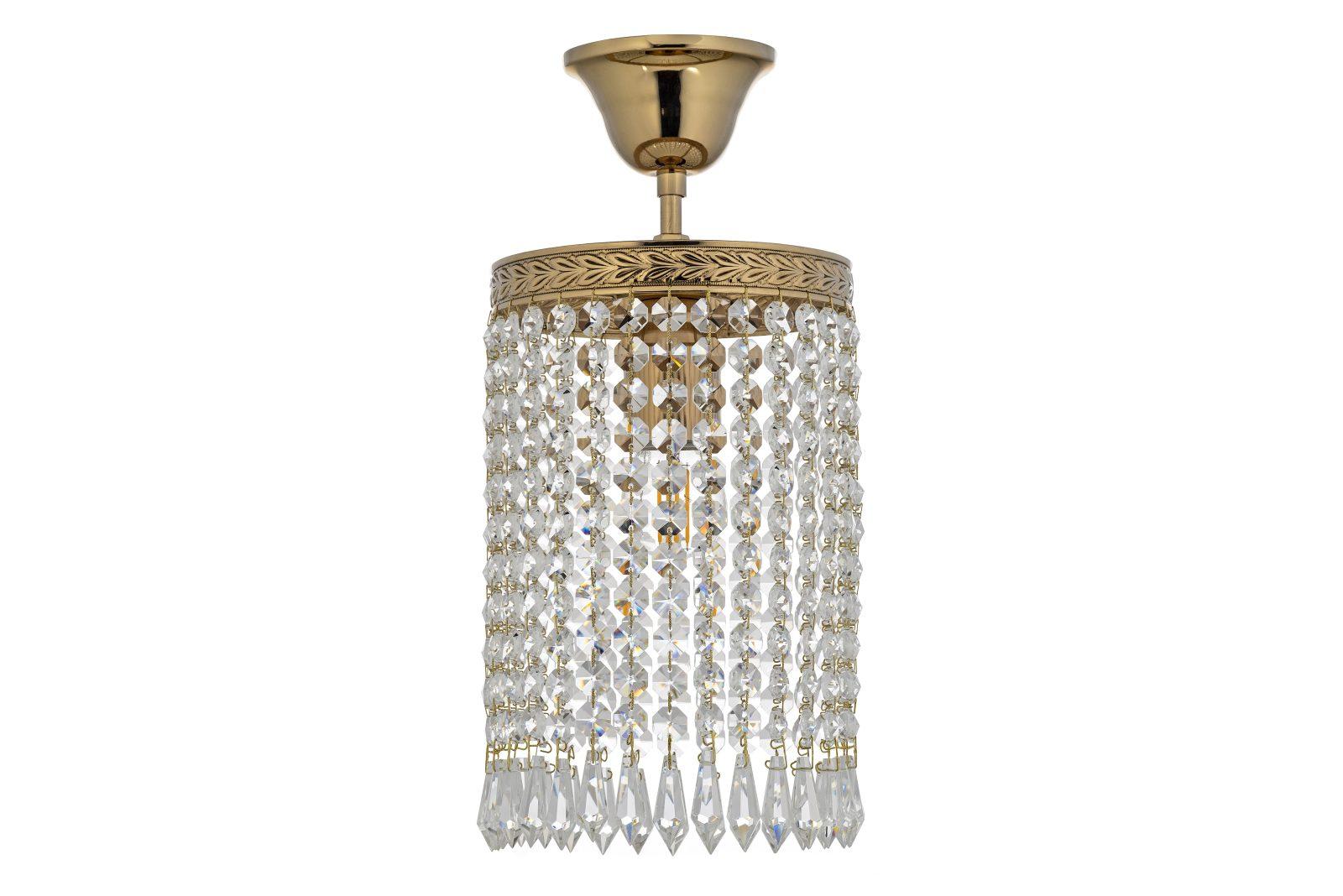металла золотого цвета. Поверхность арматуры матовая. Плафон изготовлен из хрусталя прозрачного цвета. с глянцевой поверхностью. Декоративные элементы выполнены из прозрачного хрусталя. Осветительный прибор рассчитан на освещение пространства площадью 3 кв. м. Тип цоколя используемых ламп E27. Производитель рекомендует использовать лампы мощностью не более 60 Вт. Суммарная мощность светильника составляет 60 Вт. Лампочки в комплект не входят. Защита от попадания влаги и пыли внутрь изделия не предусмотрена. Рекомендуем к применению в кухне, коридоре, спальне, гостиной.