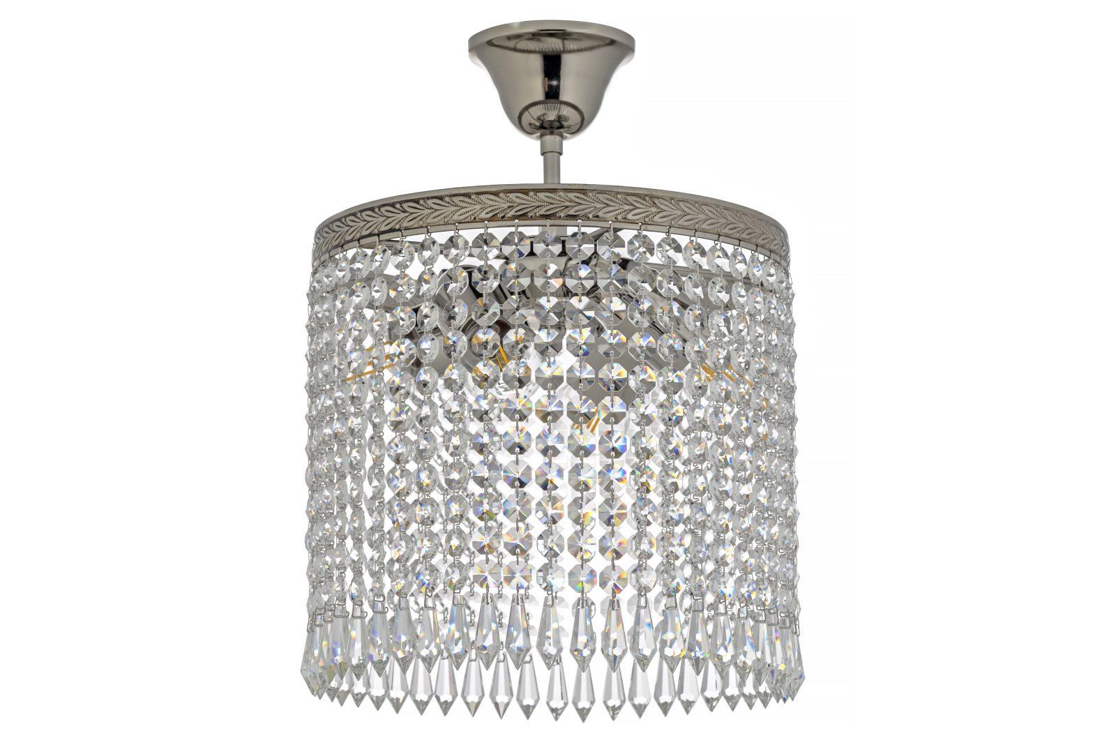 металла цвета никель. Поверхность арматуры матовая. Плафон изготовлен из хрусталя прозрачного цвета. с глянцевой поверхностью. Декоративные элементы выполнены из прозрачного хрусталя. Осветительный прибор рассчитан на освещение пространства площадью 12 кв. м. Тип цоколя используемых ламп E27. Производитель рекомендует использовать лампы мощностью не более 60 Вт. Суммарная мощность светильника составляет 240 Вт. Лампочки в комплект не входят. Защита от попадания влаги и пыли внутрь изделия не предусмотрена. Рекомендуем к применению в гостиной, кабинете, спальне.