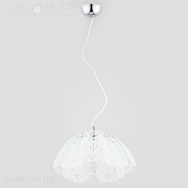металла цвета хром. Поверхность арматуры матовая. Плафон изготовлен из стекла белого цвета, имеет форму полусферы и прозрачную поверхность. Направлен вниз. Осветительный прибор рассчитан на освещение пространства площадью 5 кв. м. Тип цоколя используемых ламп E27. Производитель рекомендует использовать лампы мощностью не более 60 Вт. Суммарная мощность светильника составляет 60 Вт. Лампочки в комплект не входят. Защита от попадания влаги и пыли внутрь изделия не предусмотрена. Рекомендуем к применению в гостиной, кабинете, кухне, прихожей, спальне.