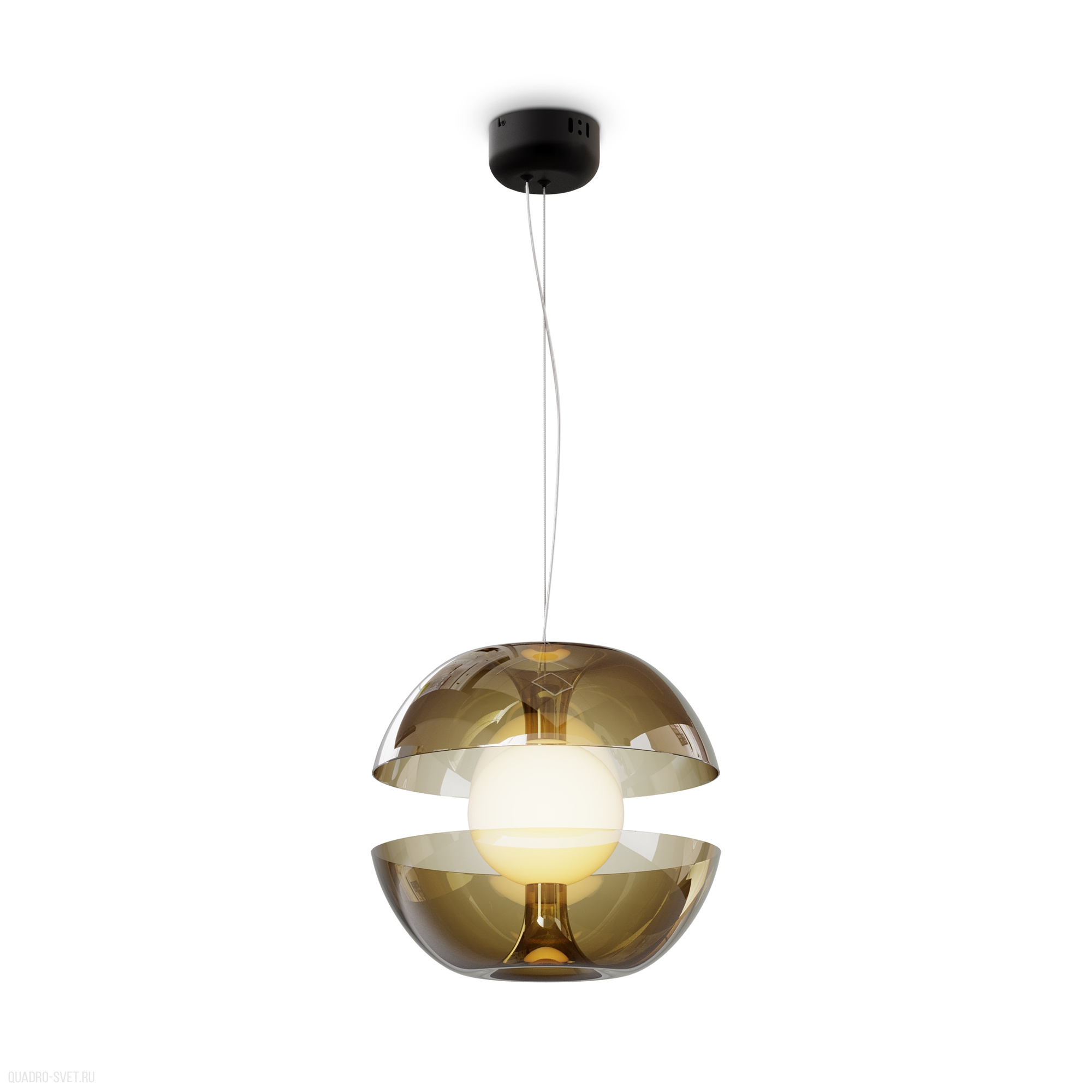 Металлическая арматура в двух оттенках: хром и золото. Плафон из матового стекла. Внешний стеклянный декор в дымчатом и янтарном цвете. Тренд — оптическая иллюзия, эффект парения светового элемента. LED-источник света. Цветовая температура 3000К.