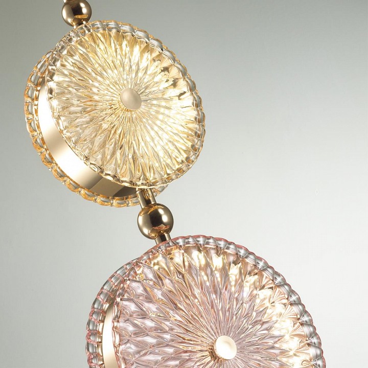 Линия светильников Caramella получила своё название благодаря сходству с карамельными конфетами. В ней сочетаются стекло нежных пастельных оттенков, золотой металл, разнообразные паттерны стёкол и современный LED источник света. Светильники Caramella прекрасно впишутся как в современные, так и в классические интерьеры, благодаря своему изящнуму дизайну. Из подвесных и настенных светильников линии можно создавать разнообразные композиции, внося в интерьер уникальыне акценты.