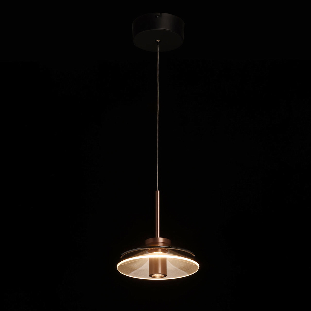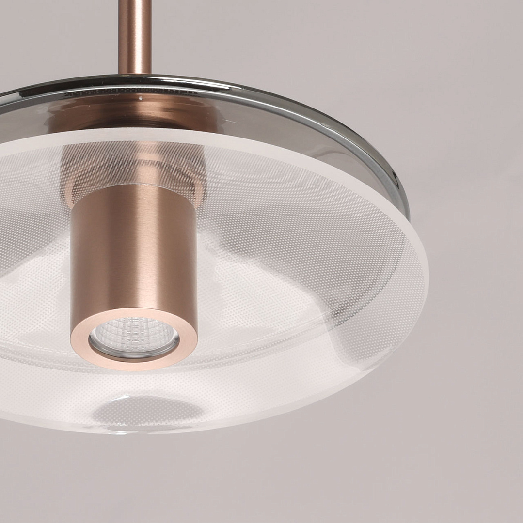 Минималистичный дизайн соответствует современным трендам. Модное сочетание контрастного черного и цвета меди. Стильно оформленный плафон, комбинированный стеклом дымчатого цвета и прозрачным акрилом, создает красивое освещение. Использование сплава алюминия в плафоне позволяет эффективно отводить тепло от светодиодов и продлевает время эксплуатации подвеса. Возможность устанавливать комфортную высоту. Светодиодные источники света безопасны и экономичны.