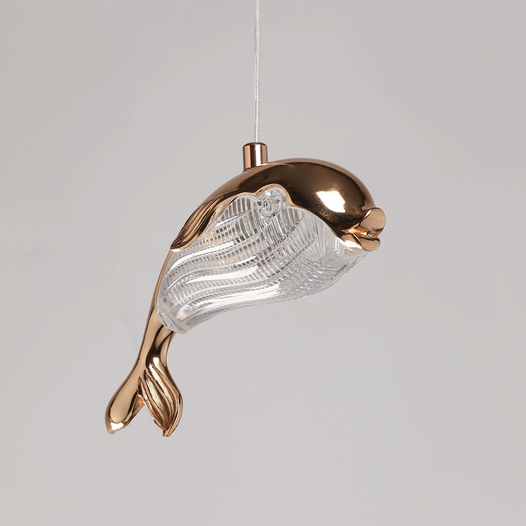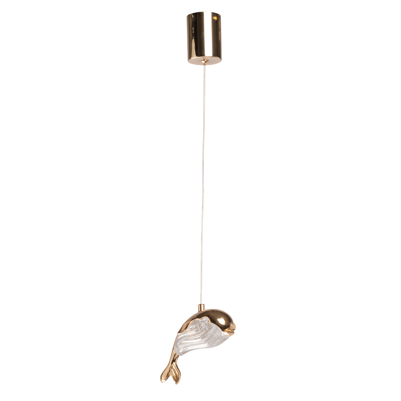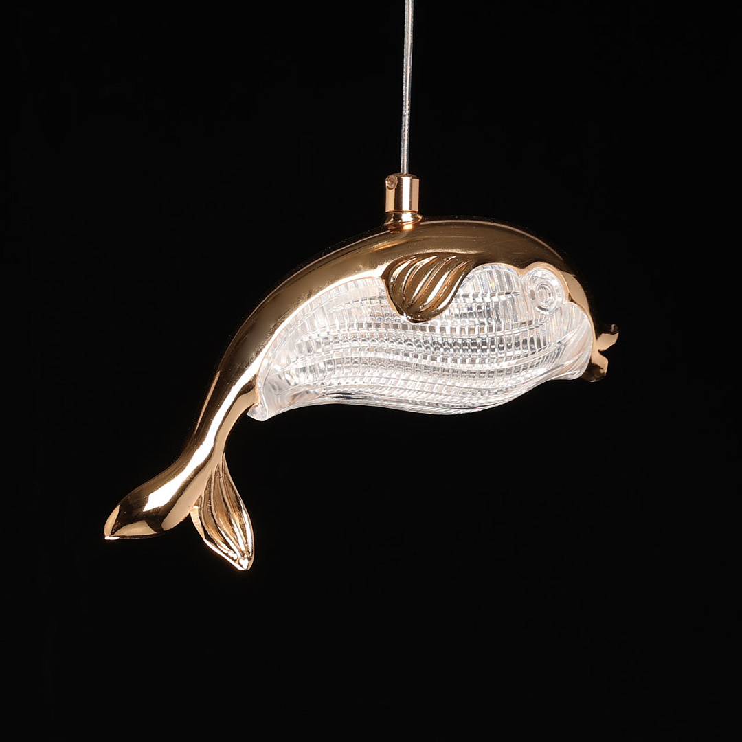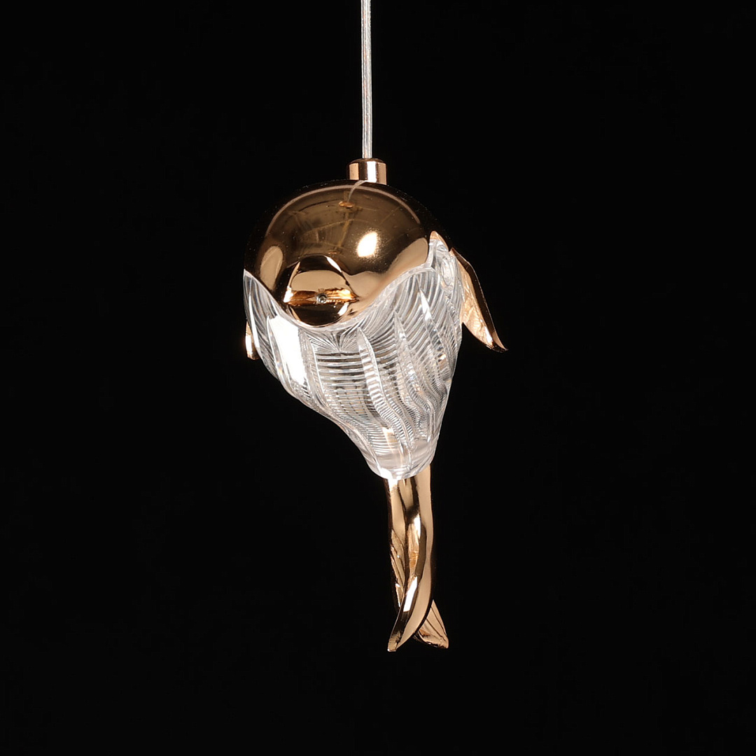 Цвет золота придает подвесу изысканности. Сочетание  классического цвета и инновационных светодиодов привлекает внимание к подвесу и создает единый образ. Уникальность подвесу придает плафон в виде фигурки дельфина. Возможность регулировать комфортную высоту. Светодиодные источники света безопасны и экономичны.