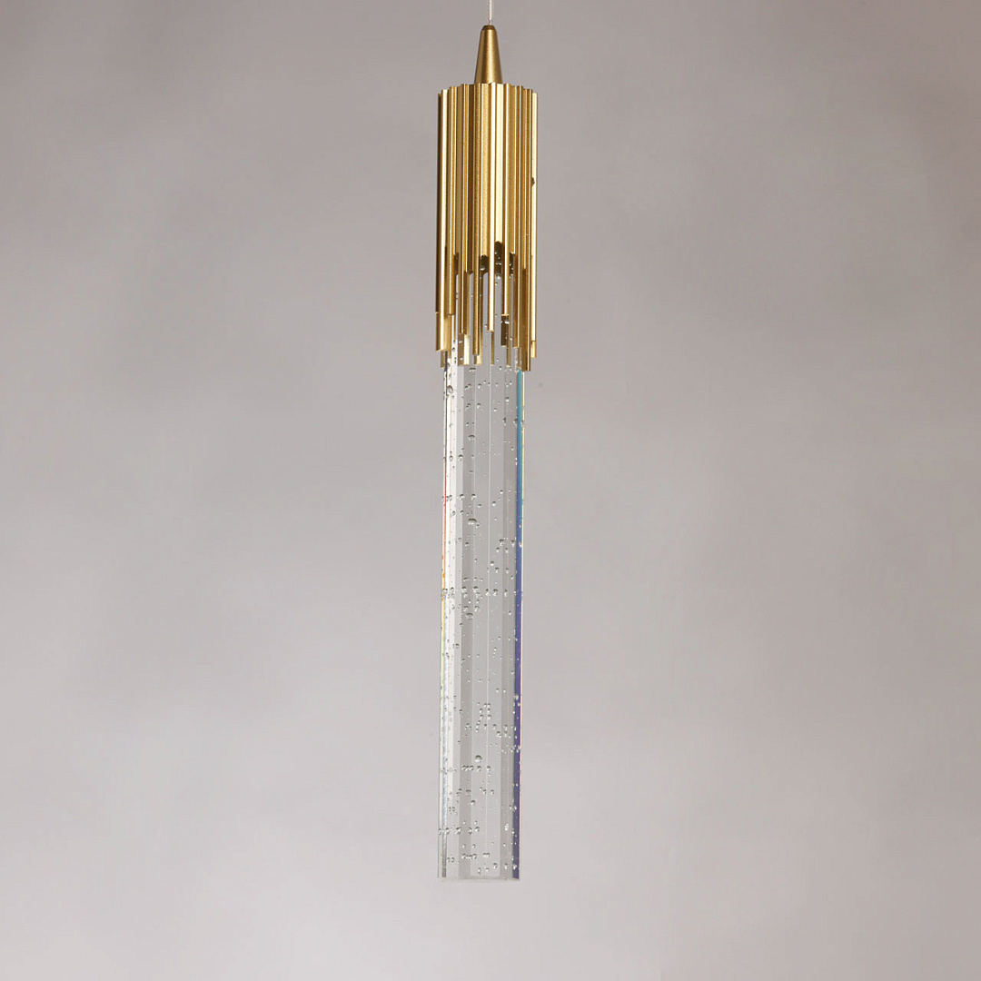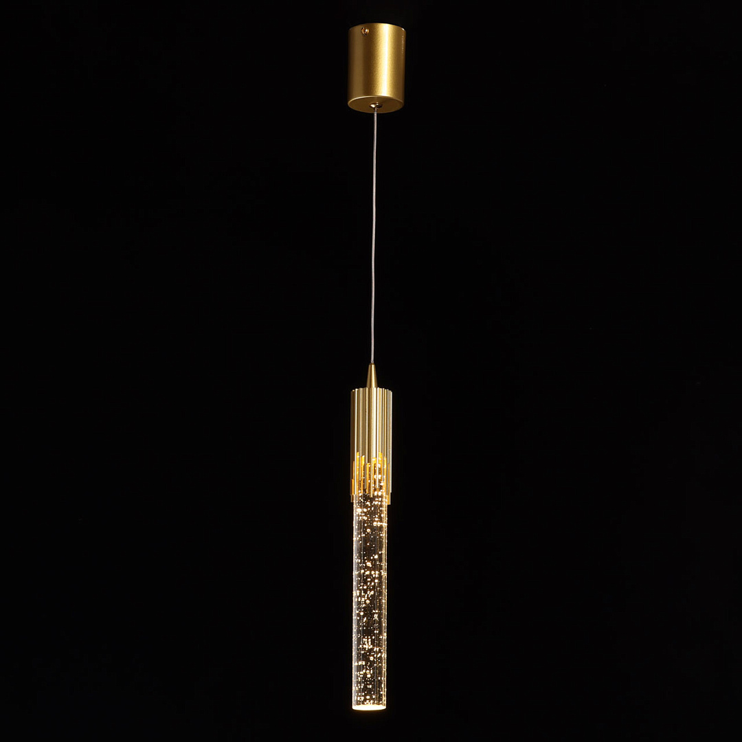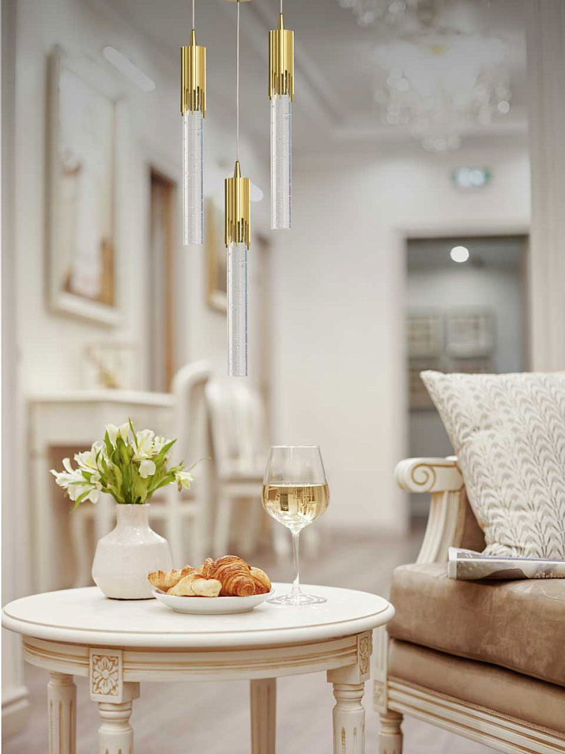 Цвет золота придает подвесу изысканности. Необычное сочетание современного стиля, классического цвета и инновационных светодиодов привлекает внимание к подвесу и создает единый образ. Красиво преломляющие свет пузырьки создают неповторимую игру. Возможность регулировать комфортную высоту. Светодиодные источники света безопасны и экономичны.