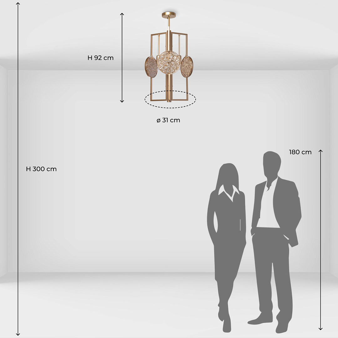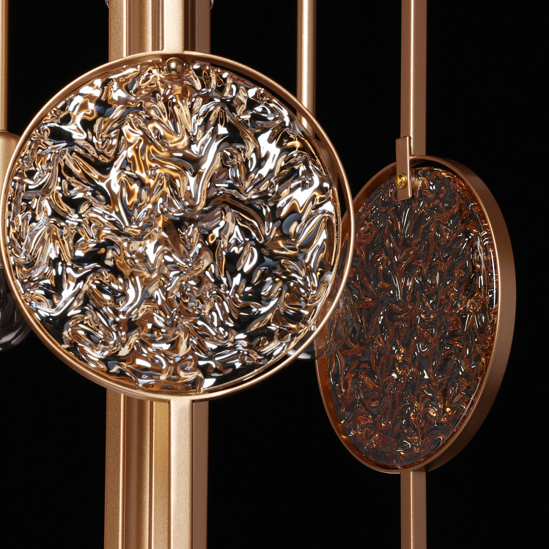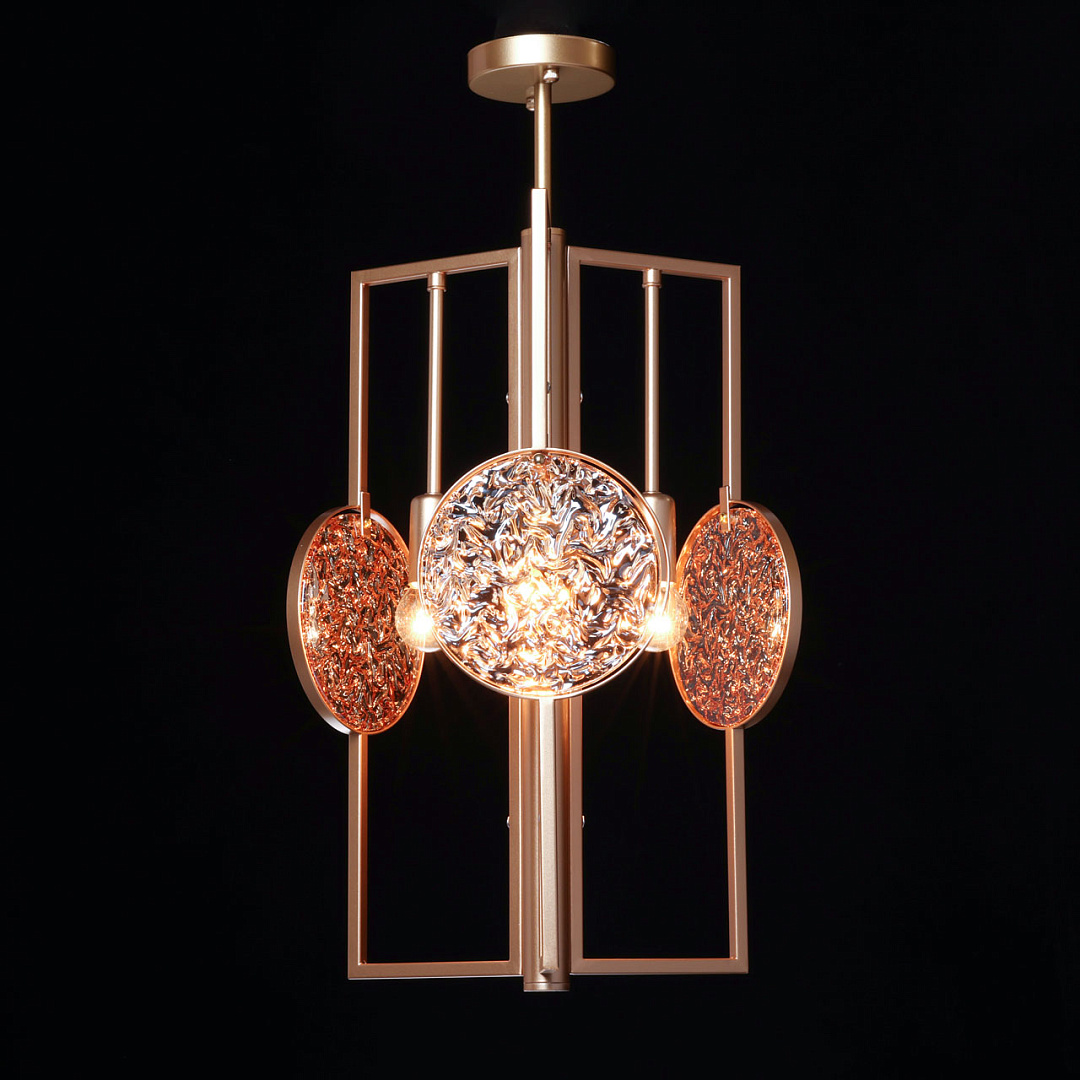 Цвет основания перламутровое золото добавляет подвесной люстре шарма и привлекательности. Оригинальные декоративные элементы из фактурного стекла придают люстре уникальности, делают ее прекрасным дополнением к интерьеру. Янтарный цвет стеклянного декора мягко рассеивает свет, создавая романтичную атмосферу. Возможность устанавливать комфортную высоту. Заменяемые источники света удобны в эксплуатации.