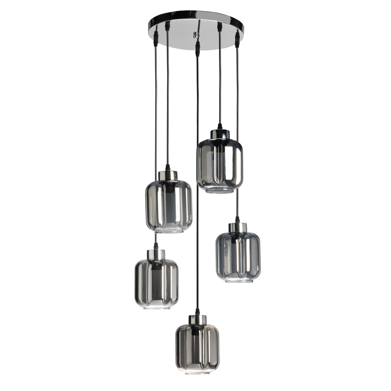 Центральное место в конструкции люстры Лоск занимает надежное основание из металла, покрытого гальваническим хромированием. Это не просто декоративное решение – хромированное покрытие обеспечивает долговечность и устойчивость к коррозии, гарантируя долгий срок службы светильника.  Блеск хрома придает люстре современный, слегка футуристический вид, идеально вписывающийся в концепцию хай-тека или минимализма.Однако, строгая элегантность основания смягчается пятью плафонами из дымчатого стекла, подвешенными на регулируемых по высоте подвесах.  Эта гибкость позволяет адаптировать освещение под индивидуальные потребности и особенности помещения. Вы можете разместить плафоны на разной высоте, создавая уникальные световые композиции, играя с глубиной и интенсивностью освещения.  Дымчатое стекло, мягко рассеивая свет, добавляет в интерьер нотку таинственности.Форма плафонов, напоминающая стилизованные бочонки, придает люстре оригинальность и визуальную легкость.  В качестве источников света используются сменные лампочки с распространенным цоколем E27. Это позволяет легко подобрать лампы нужной мощности и цветовой температуры, создавая желаемое освещение – от теплого и уютного до холодного и функционального.  Светового потока достаточно для комфортного освещения площади до 15 м², что делает люстру идеальным решением для гостиных, столовых, кухонь или даже спален.