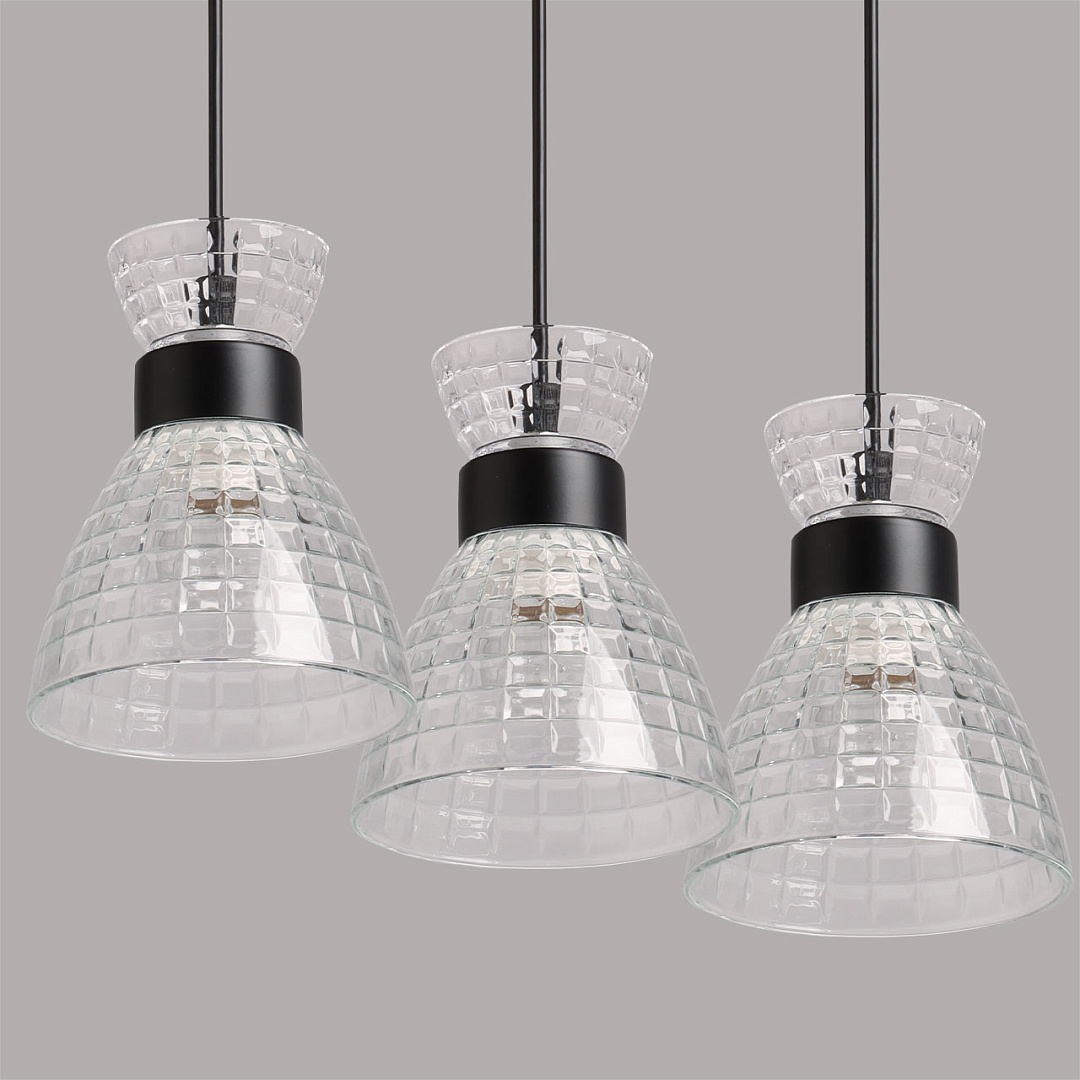 Сочетание черного цвета основания и прозрачного стекла создает модный контраст. Благодаря черному цвету люстра выглядит стильно и прекрасно подойдет в стиль лофт. Фактурное стекло красиво преломляет свет. Геометричность орнамента стеклянного плафона подчеркивает современность дизайна. Возможность устанавливать комфортную высоту. Заменяемые источники света удобны в эксплуатации.