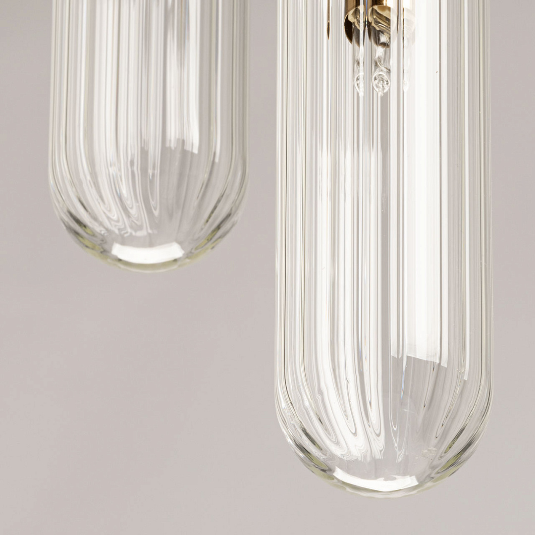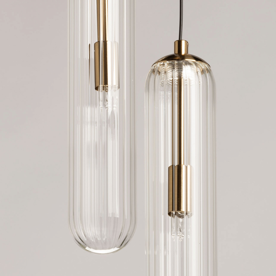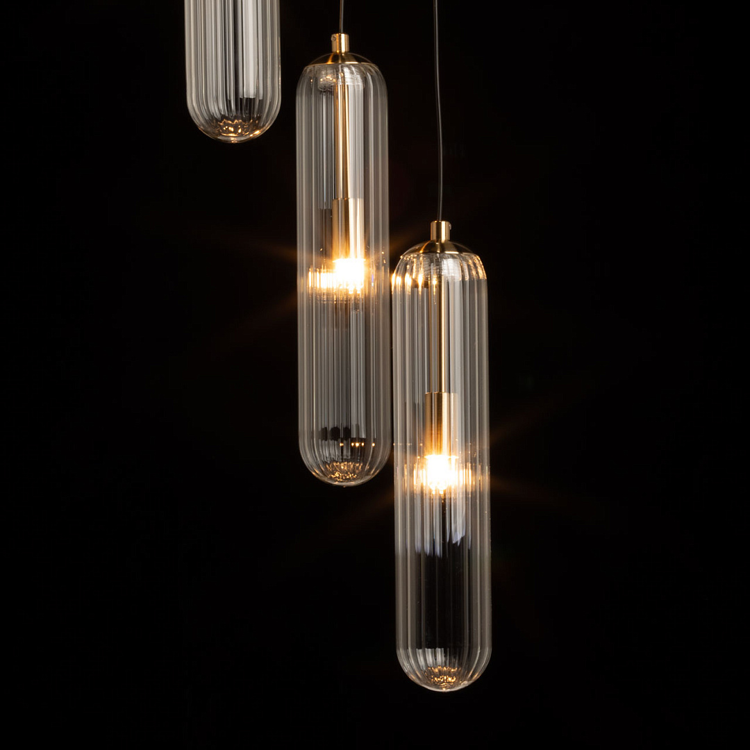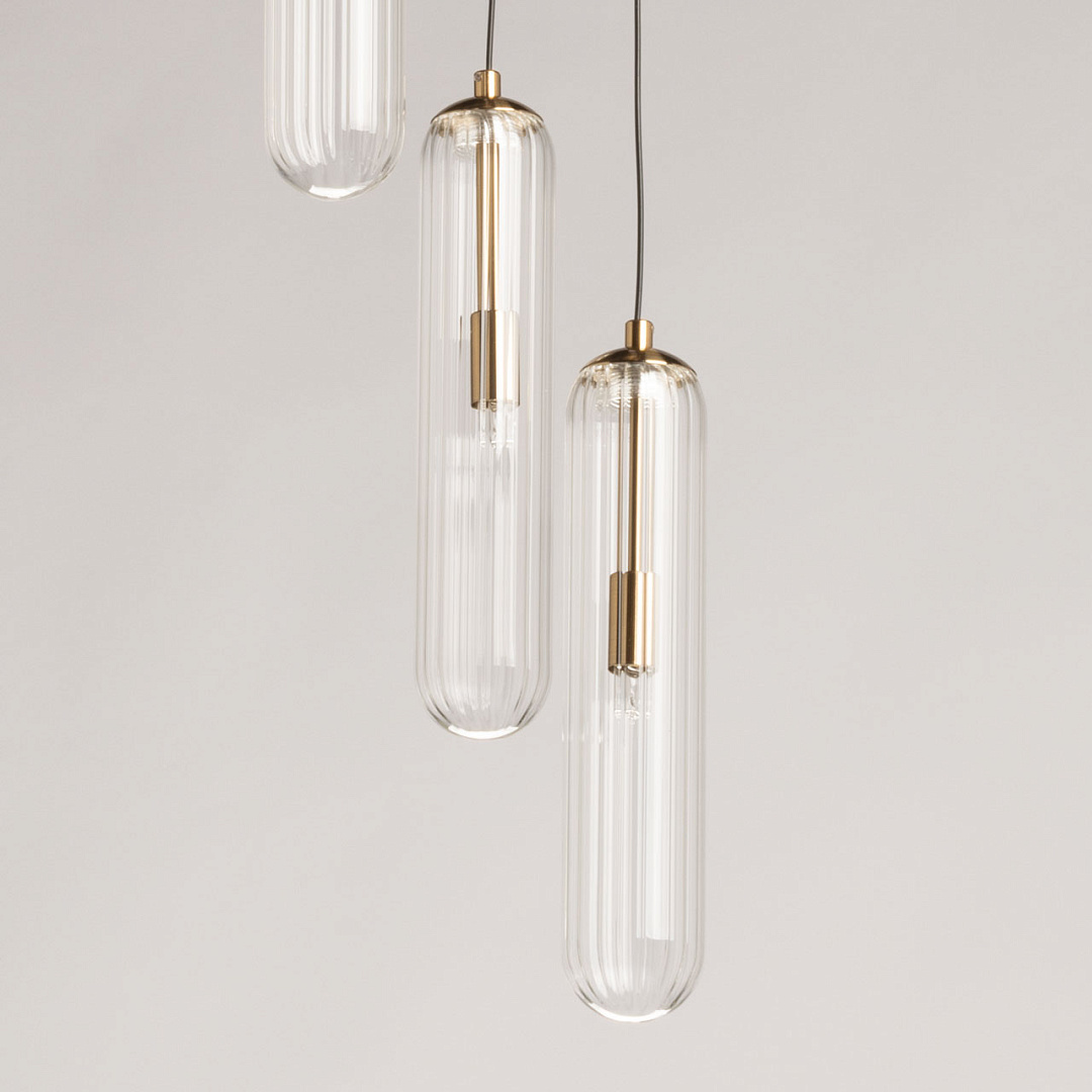 Минималистичный дизайн не только добавляет элегантности и стиля, но и позволяет легко вписаться в большинство современных интерьеров. Трендовый цвет медовой бронзы придает люстре особый шарм и актуальность. Сложная форма стеклянных плафонов отлита таким образом, что создает оригинальный и уникальный визуальный эффект. Благодаря этому, свет, исходящий из люстры, преломляется и играет по-особенному, добавляя интерьеру особую атмосферу. Заменяемые источники света делают эту люстру удобной в использовании, позволяя легко заменить лампы при необходимости. Возможность регулировки высоты позволяет адаптировать ее под любой потолок, что делает ее универсальной для различных помещений.