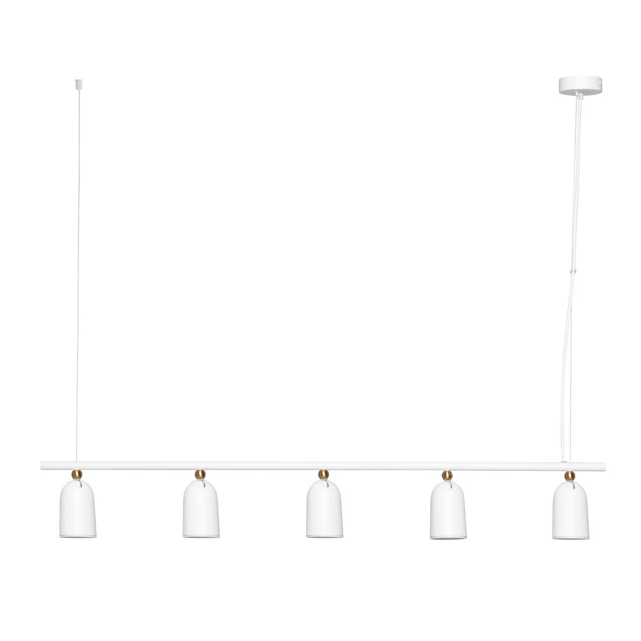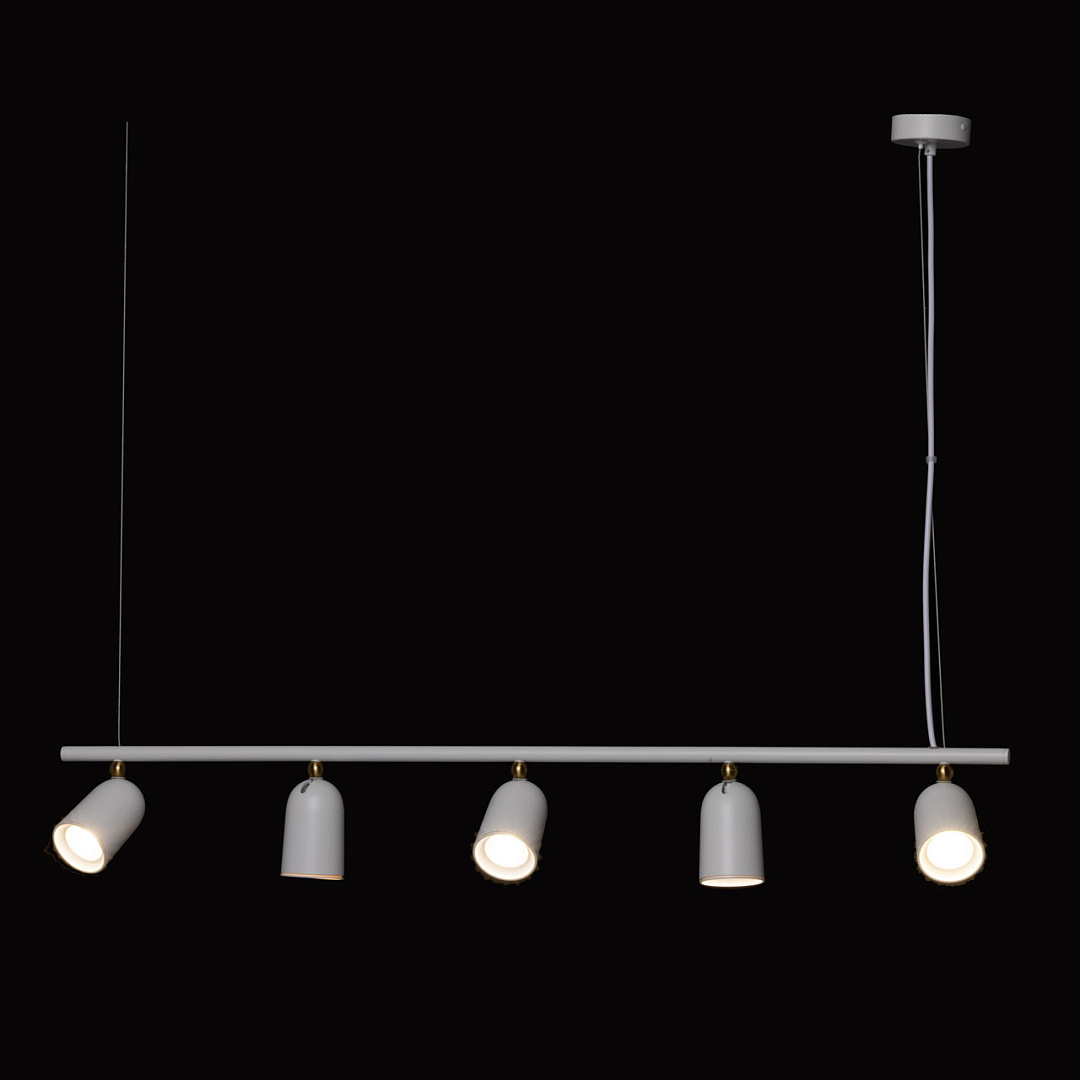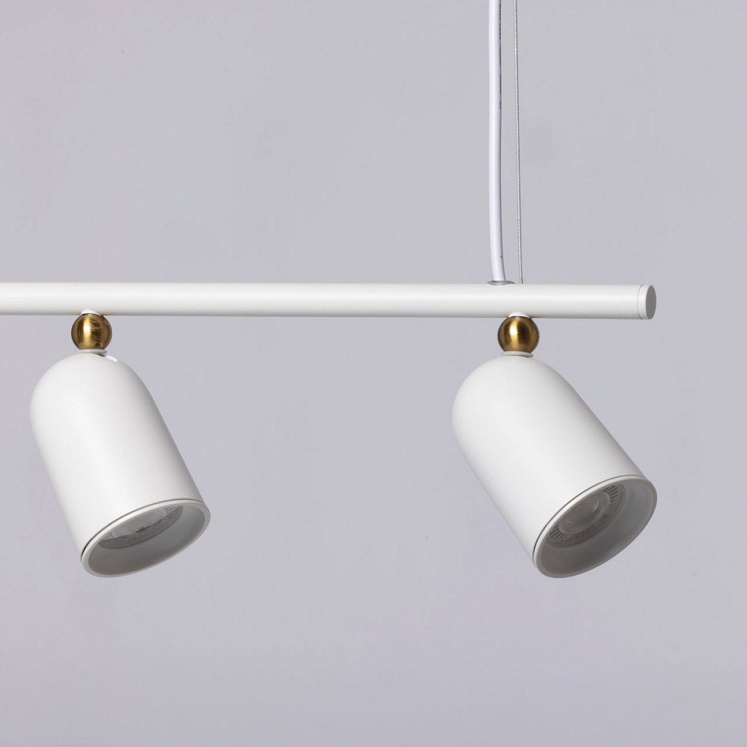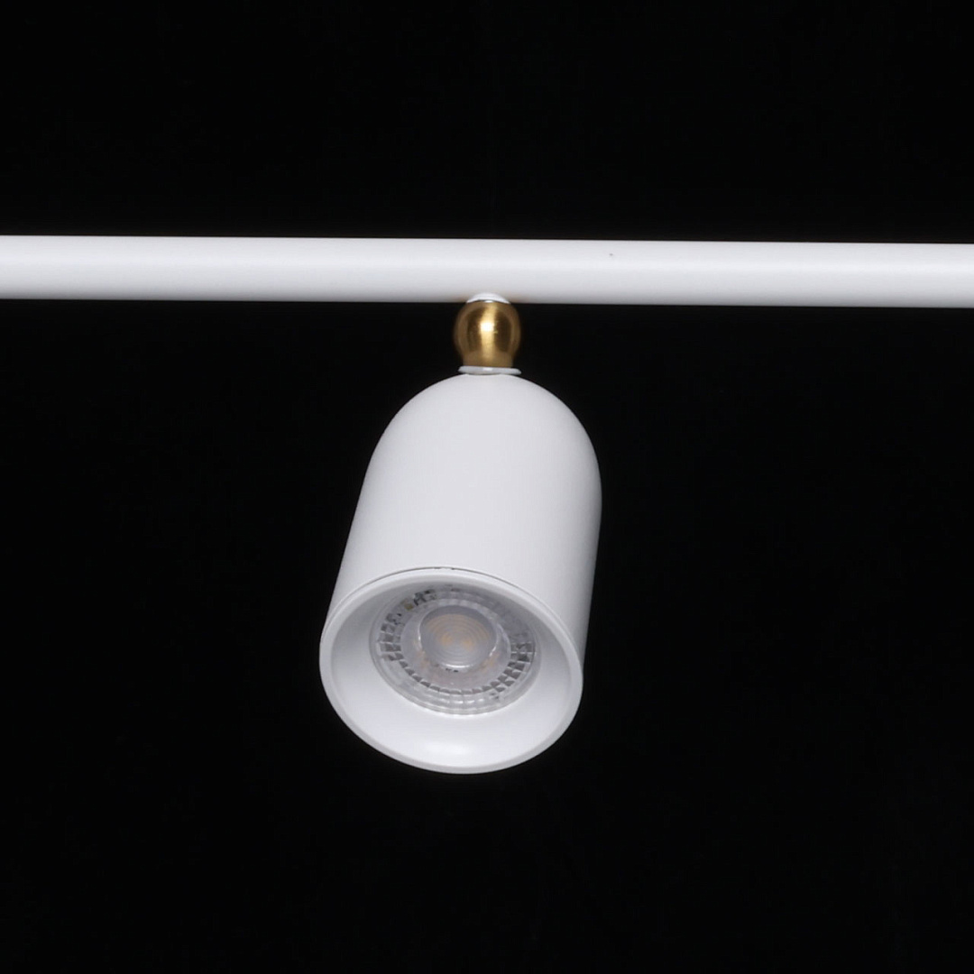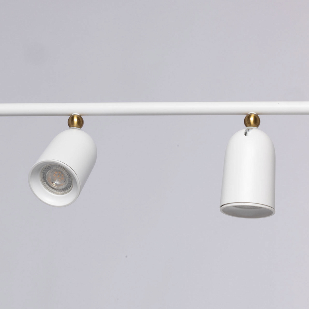 Белый цвет придает люстре свежий и современный вид. Для дополнительного декоративного эффекта, плафоны декорированы металлической сферой. Сочетание белого цвета и декора цвета латуни добавляет люстре утончённости. Поворотные плафоны позволяют направлять световой поток в нужную сторону, что создает комфортное освещение. Вариативность световых решений и фактур подчеркнет стиль и индивидуальность интерьера. Возможность регулировать комфортную высоту. Заменяемые источники света удобны в эксплуатации.