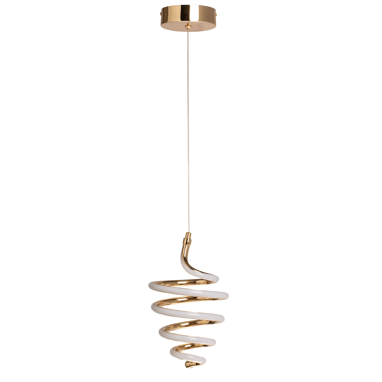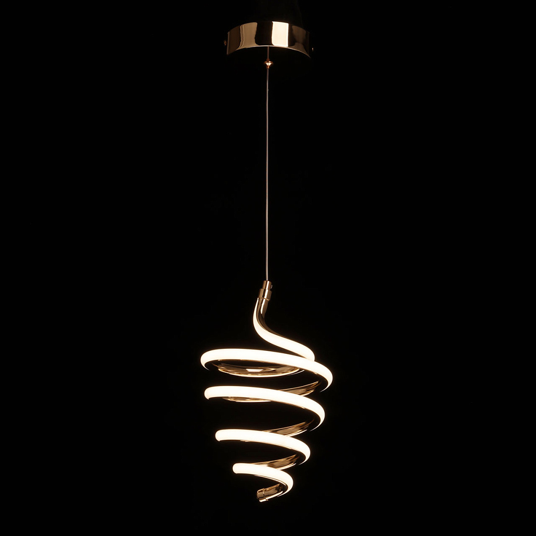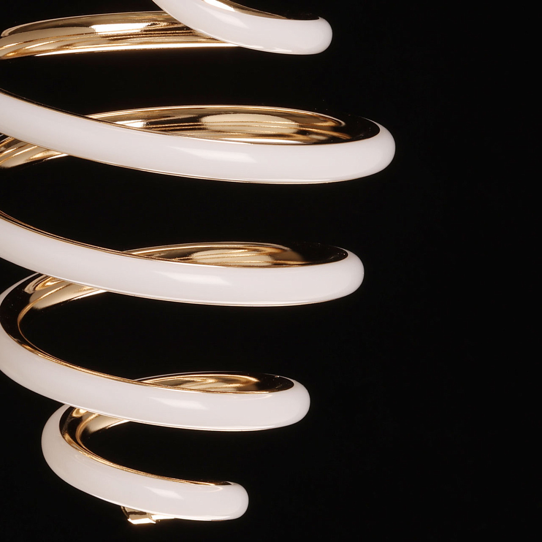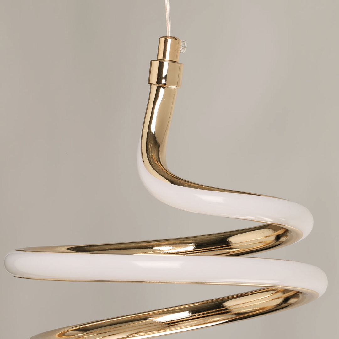 Насыщенный золотой цвет придает подвесу благородства, а в  сочетании с оригинальным дизайном делает его привлекательным акцентом в интерьере. Динамично закрученная спираль становится прекрасным выбором для современного интерьера. Сплав алюминия обеспечивает качественное отведение тепла и продлевает срок службы светодиодов. Светодиодные источники света экономичны и безопасны. Возможность устанавливать комфортную высоту.