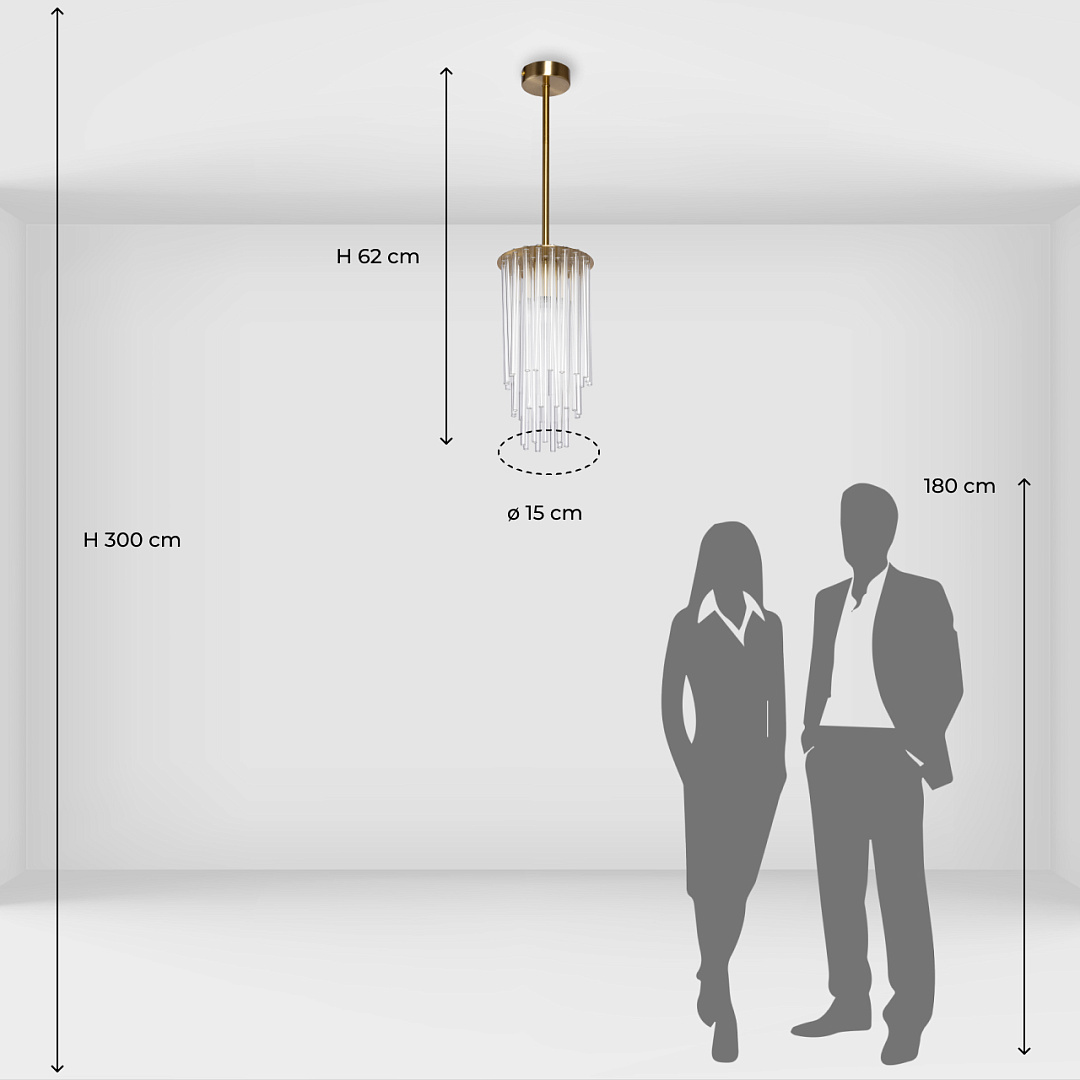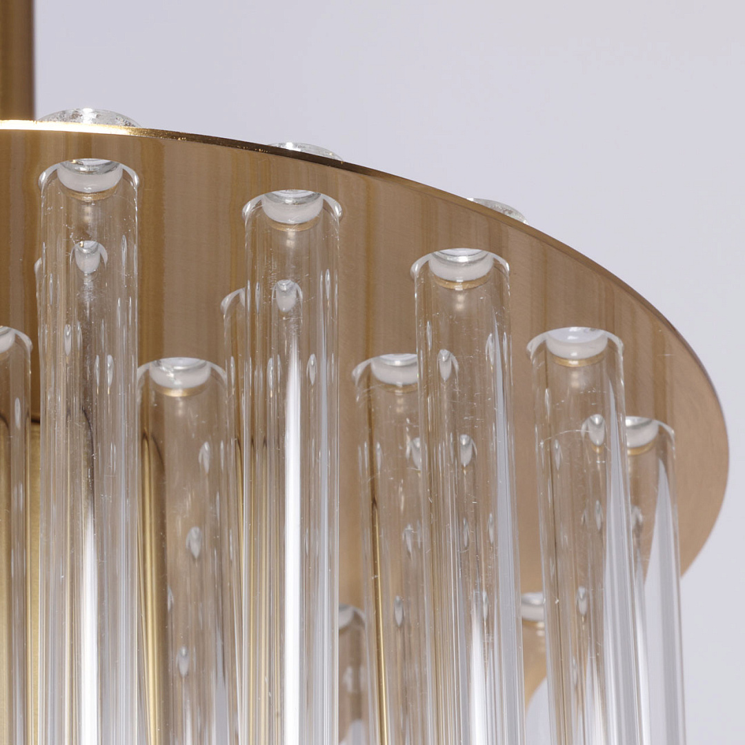 Гальваника в цвет латуни придает люстре благородный вид. Стеклянный декор создает уникальную игру света и тени и создает особый шарм и уникальность. Светильник  идеально подходит для расслабляющих вечеров или романтических ужинов. Заменяемые источники света удобны в эксплуатации.