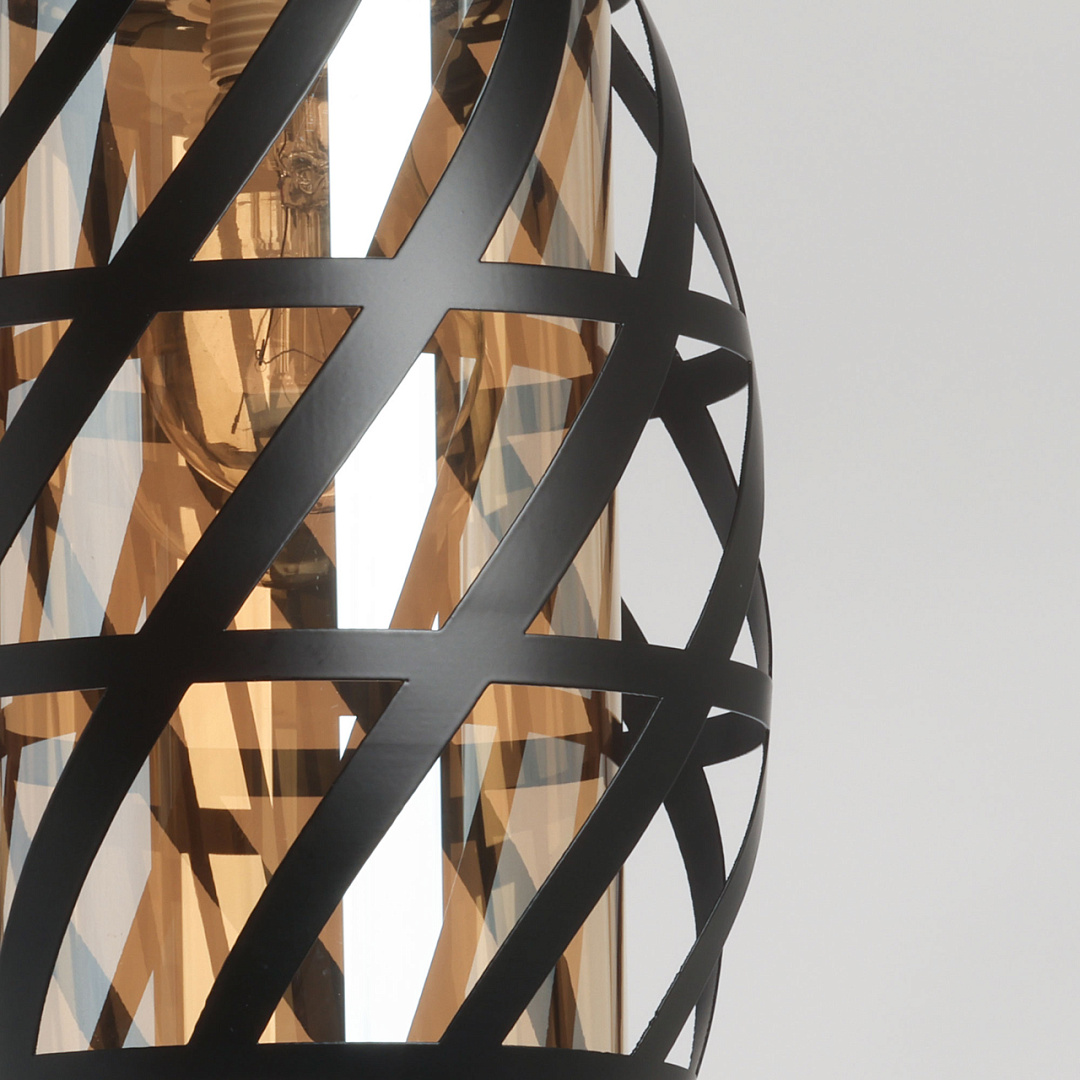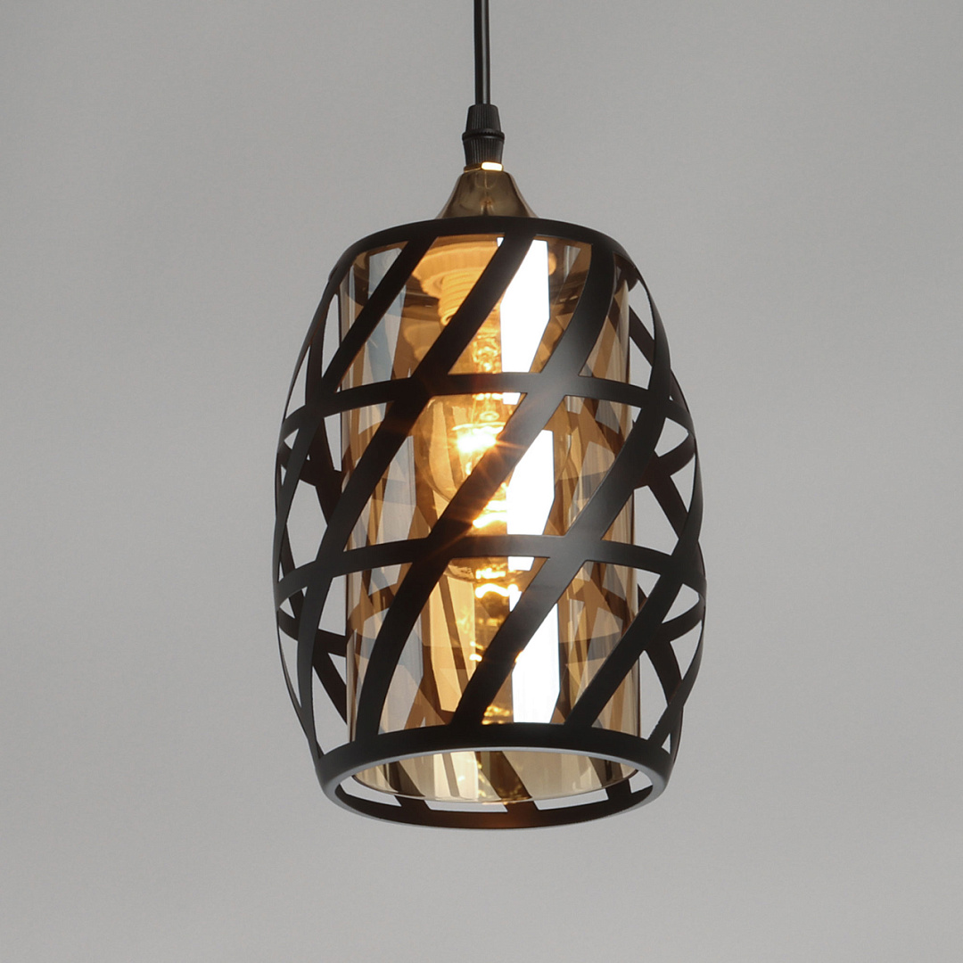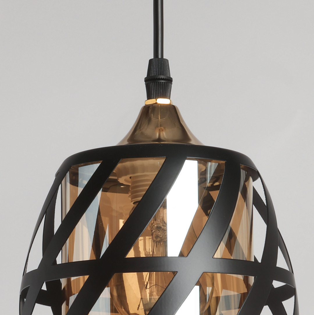 Одиночный подвес создает комфортное зональное освещение. Сочетание на контрасте матового черного цвета и глянцевого цвета золота эффектно выделяет подвес на потолке.Черный цвет металлического плафона актуален в стиле лофт и в брутальном интерьере.Стеклянный плафон цвета шампань мягко преломляет свет.Заменяемый источник света удобен в эксплуатации.Возможность устанавливать комфортную высоту.