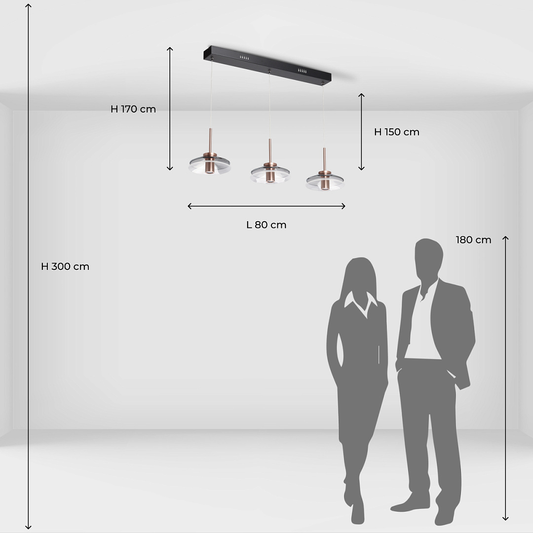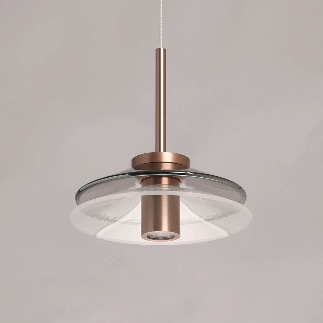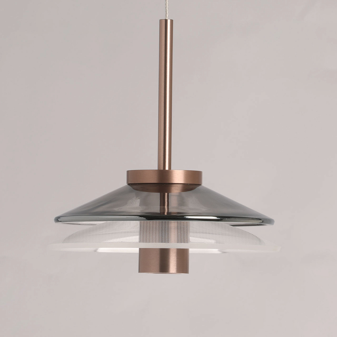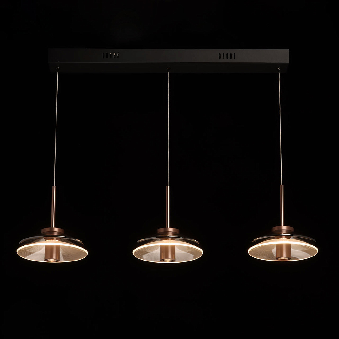 Минималистичный дизайн соответствует современным трендам. Модное сочетание контрастного черного и цвета меди. Стильно оформленный плафон, комбинированный стеклом дымчатого цвета и прозрачным акрилом, создает красивое освещение. Использование сплава алюминия в плафоне позволяет эффективно отводить тепло от светодиодов и продлевает время эксплуатации подвеса. Возможность устанавливать комфортную высоту. Светодиодные источники света безопасны и экономичны.