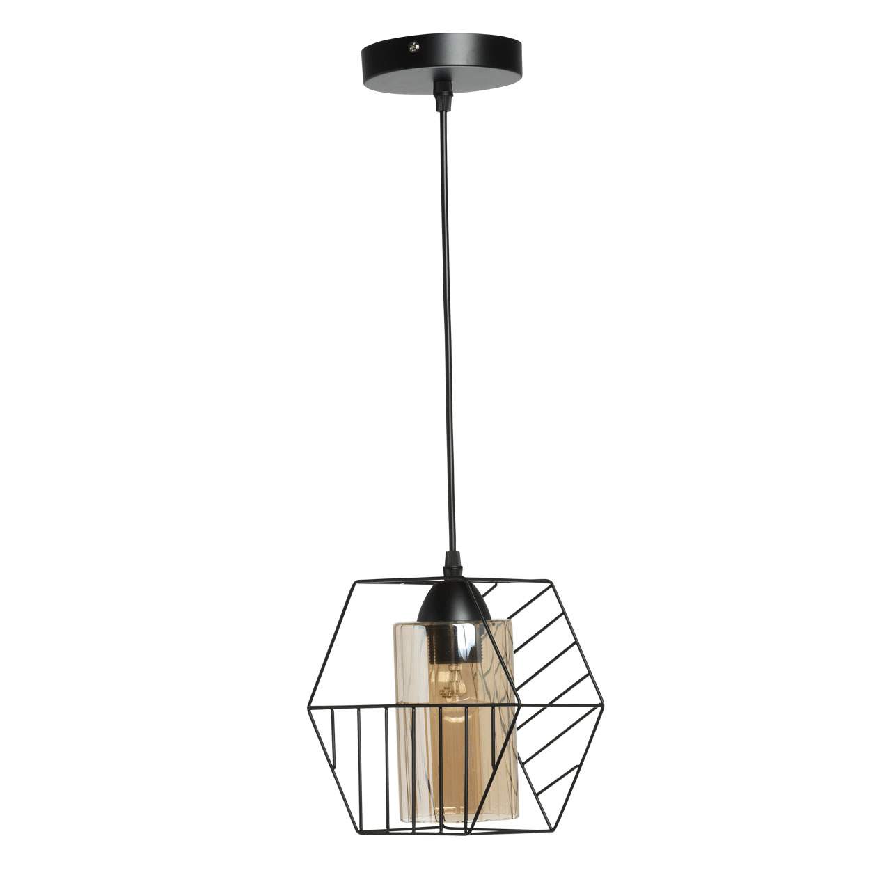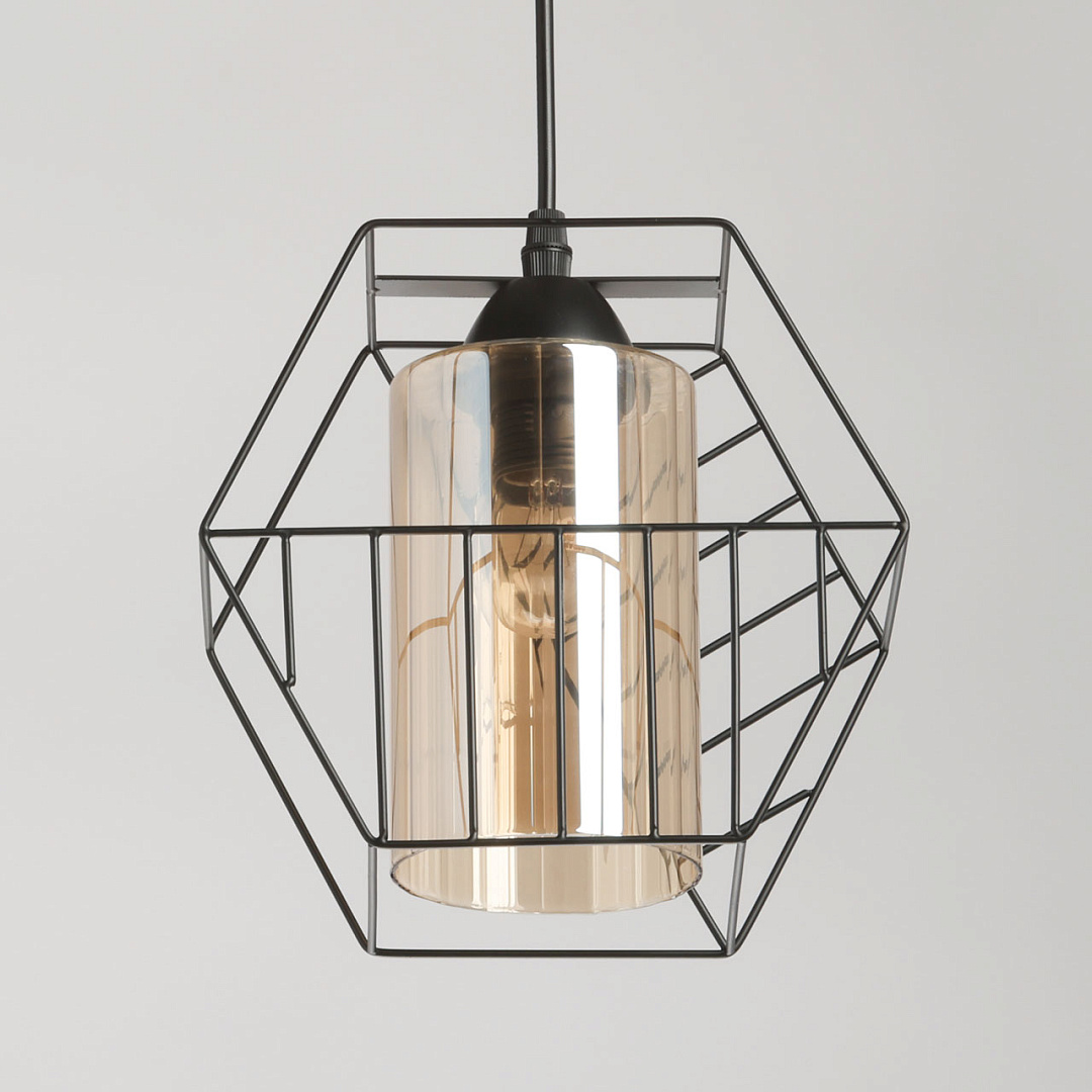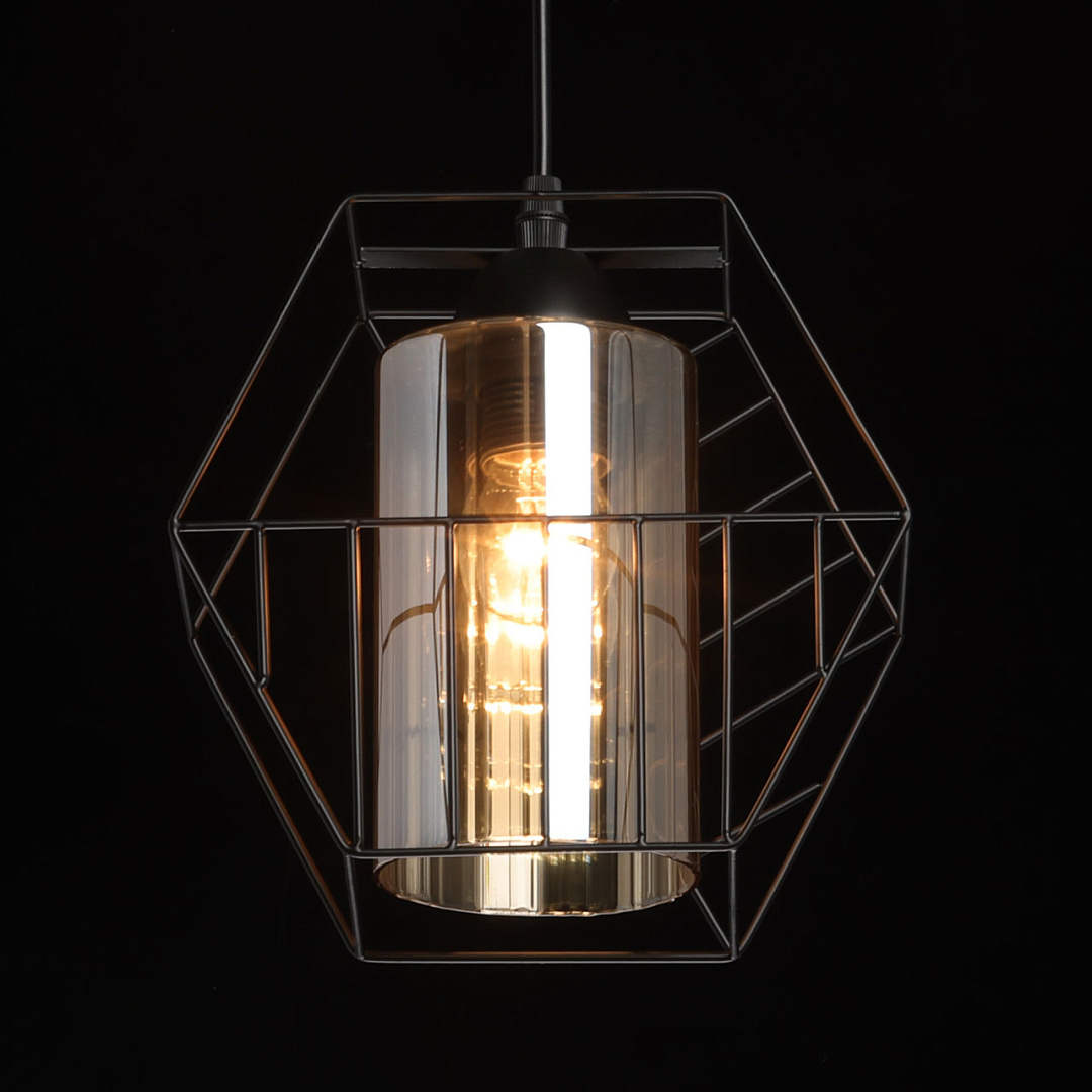 Одиночный подвес создает комфортное зональное освещение.Черный цвет металлического плафона актуален в стиле лофт и в брутальном интерьере.Тонкие геометричные линии металлического плафона поддерживают тренд линейности..Стеклянный плафон цвета шампань мягко преломляет свет.Заменяемый источник света удобен в эксплуатации