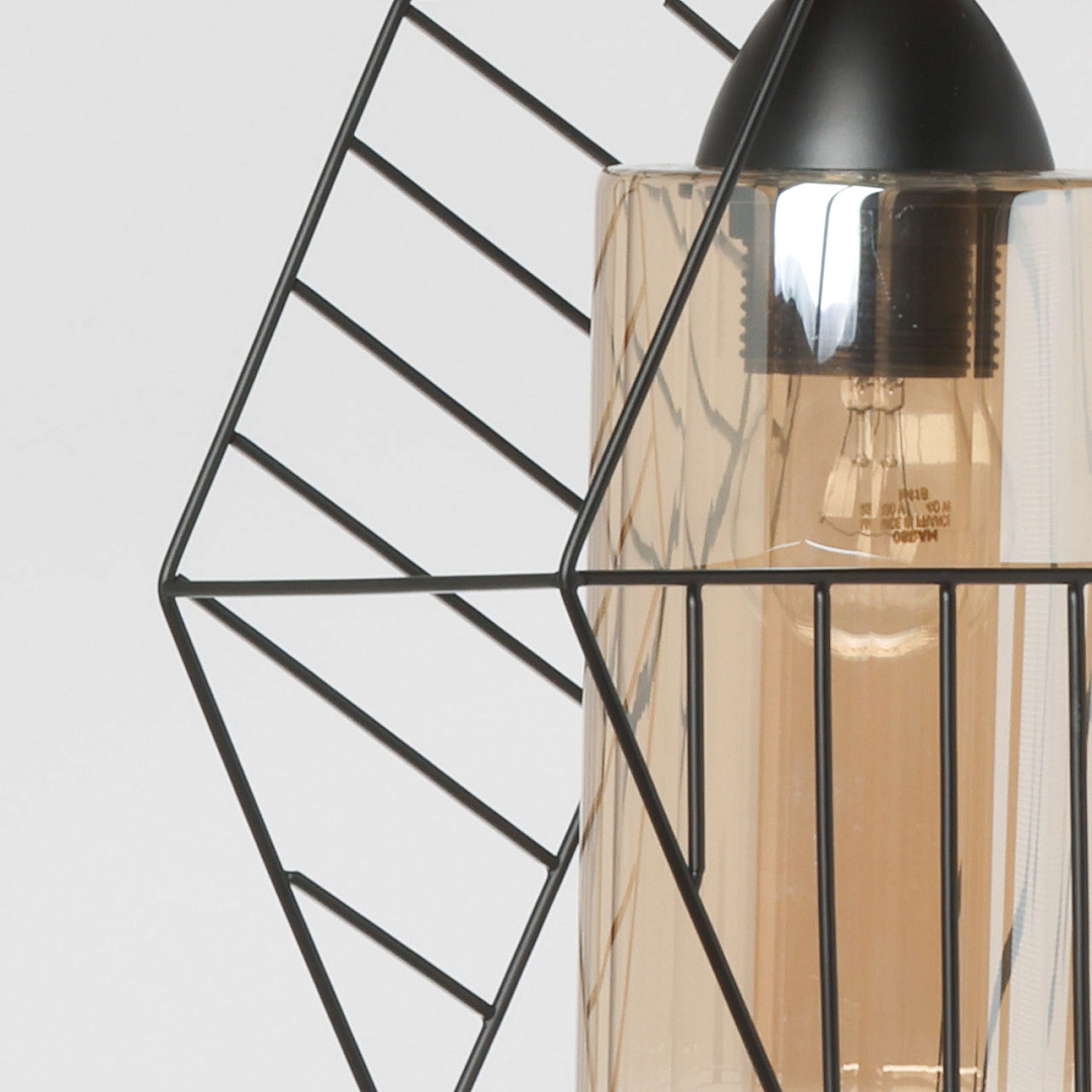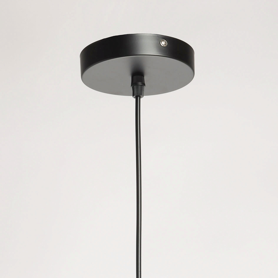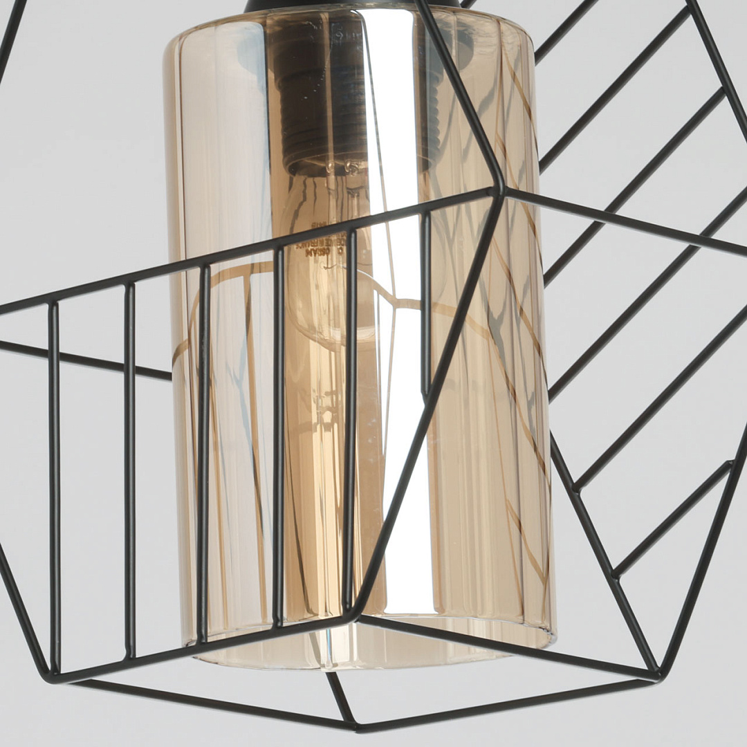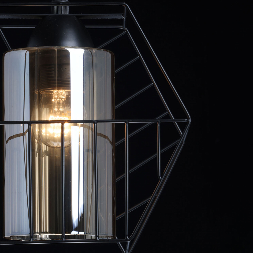 Одиночный подвес создает комфортное зональное освещение.Черный цвет металлического плафона актуален в стиле лофт и в брутальном интерьере.Тонкие геометричные линии металлического плафона поддерживают тренд линейности..Стеклянный плафон цвета шампань мягко преломляет свет.Заменяемый источник света удобен в эксплуатации