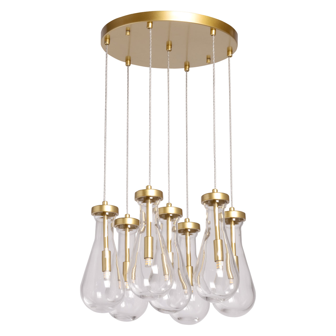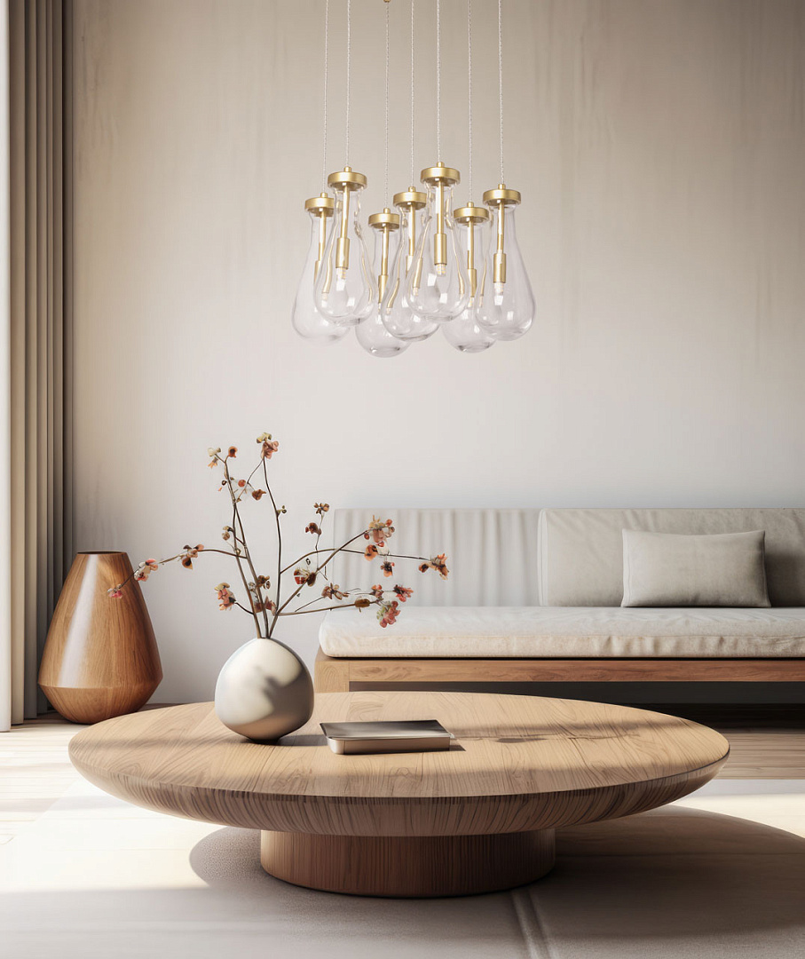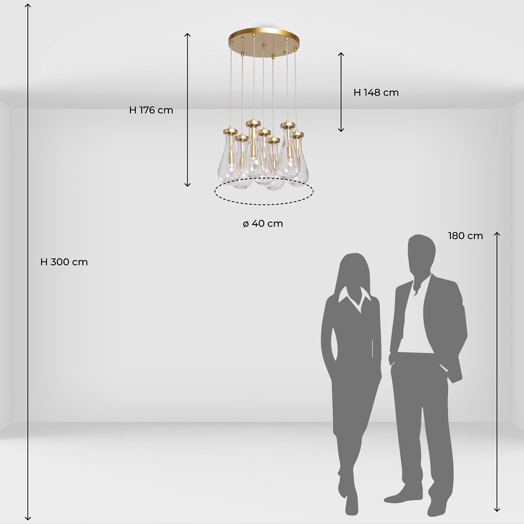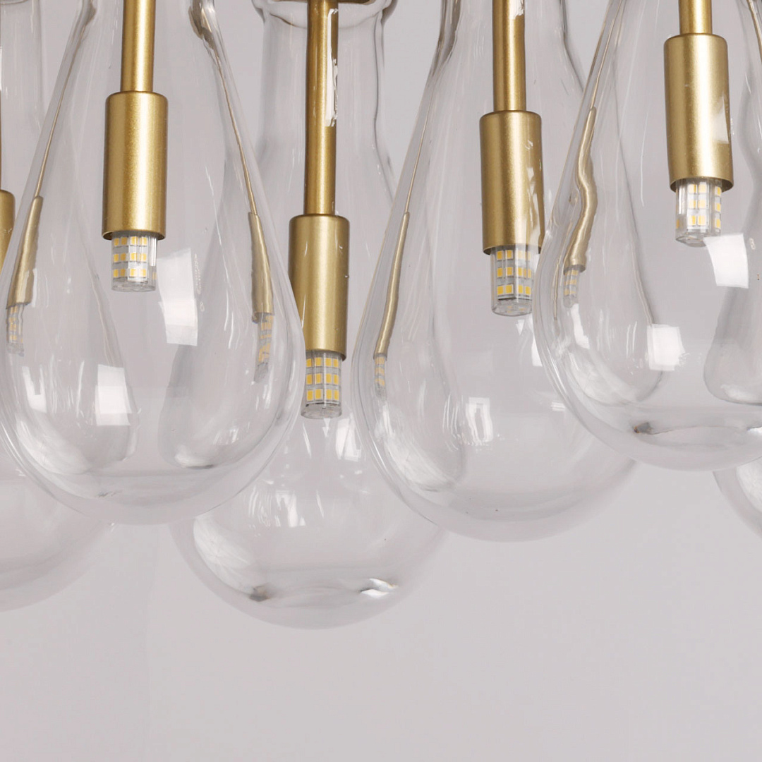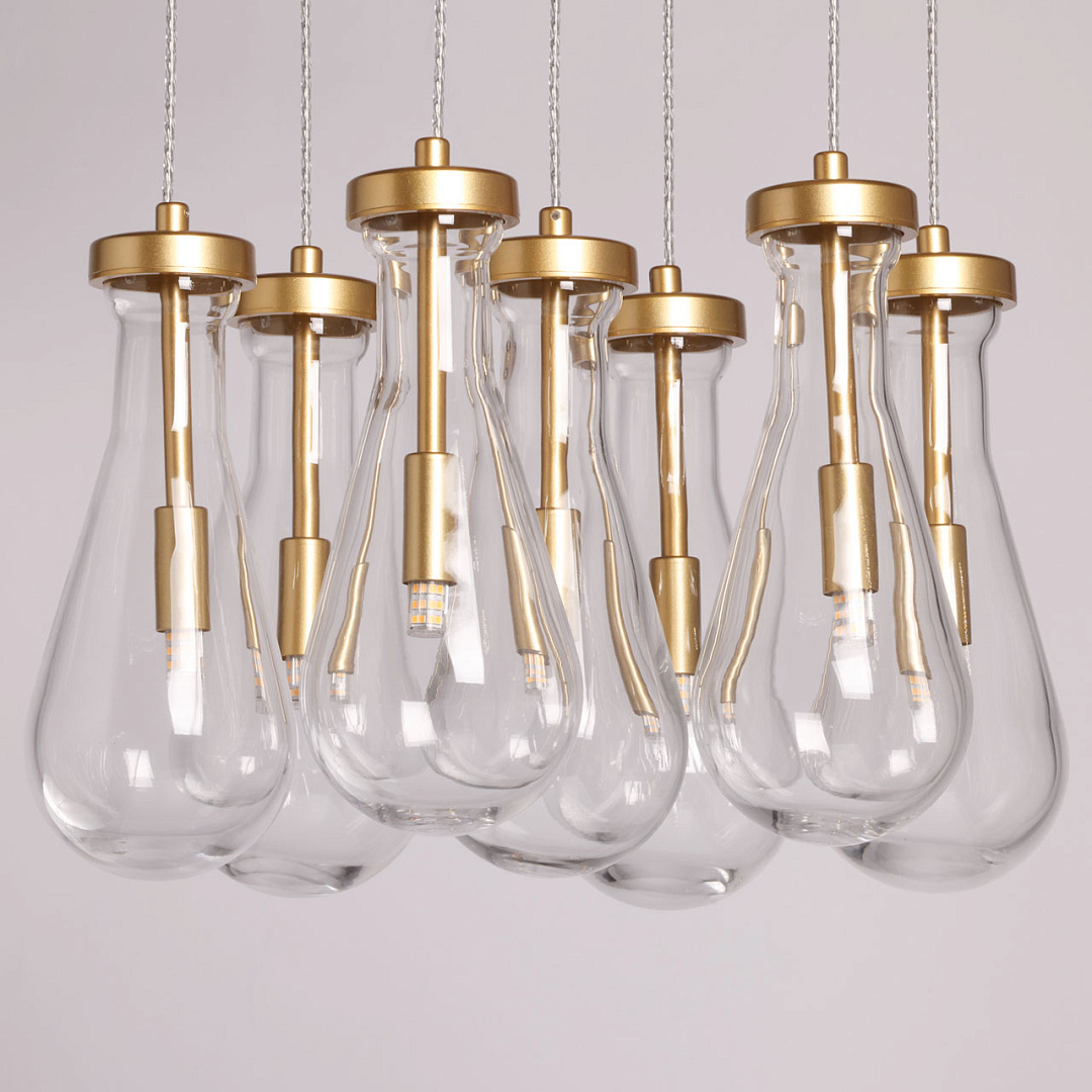 Стильный матовый золотой цвет добавляет изысканности и элегантности. Светильник привлекает внимание оригинальной формой стеклянных плафонов. Прозрачный цвет позволяет свету проникать через плафоны, создавая уникальные оттенки игры света. Возможность регулировать комфортную высоту. Заменяемые источники света удобны в эксплуатации.