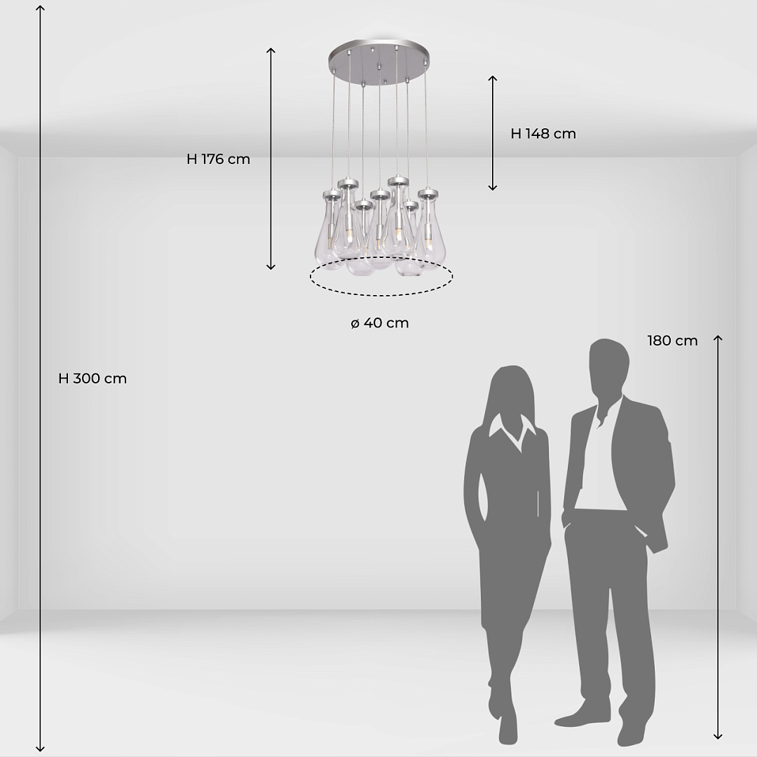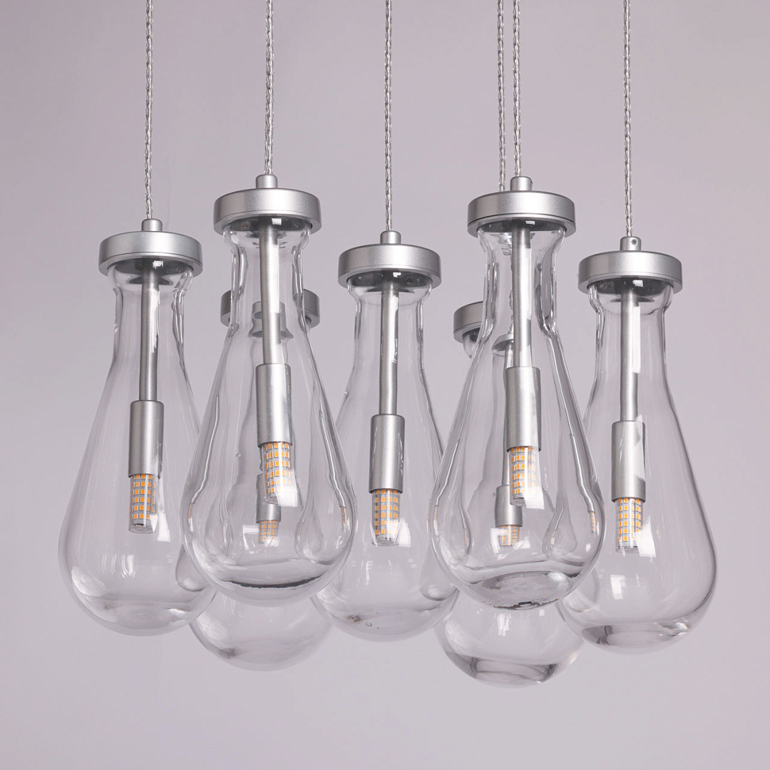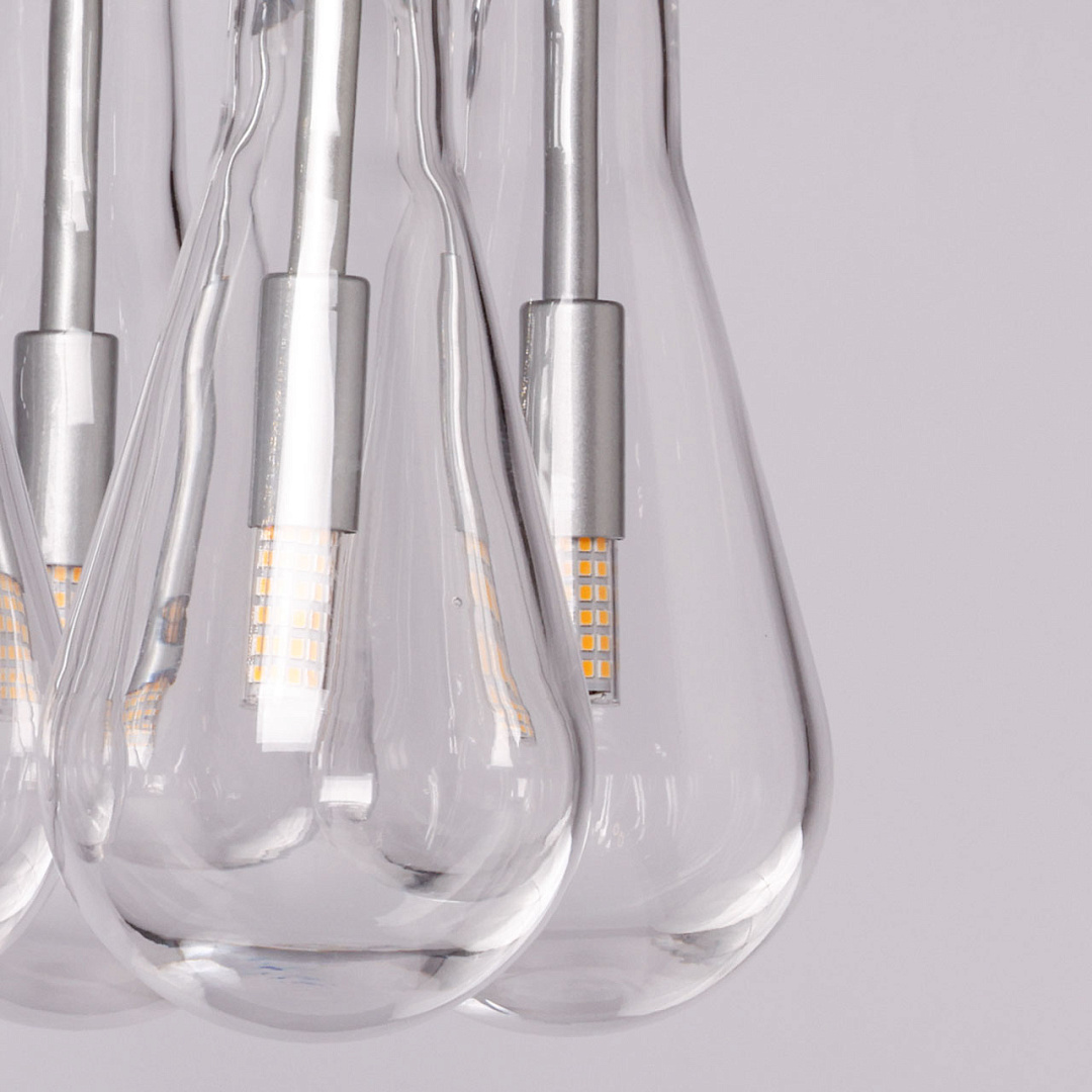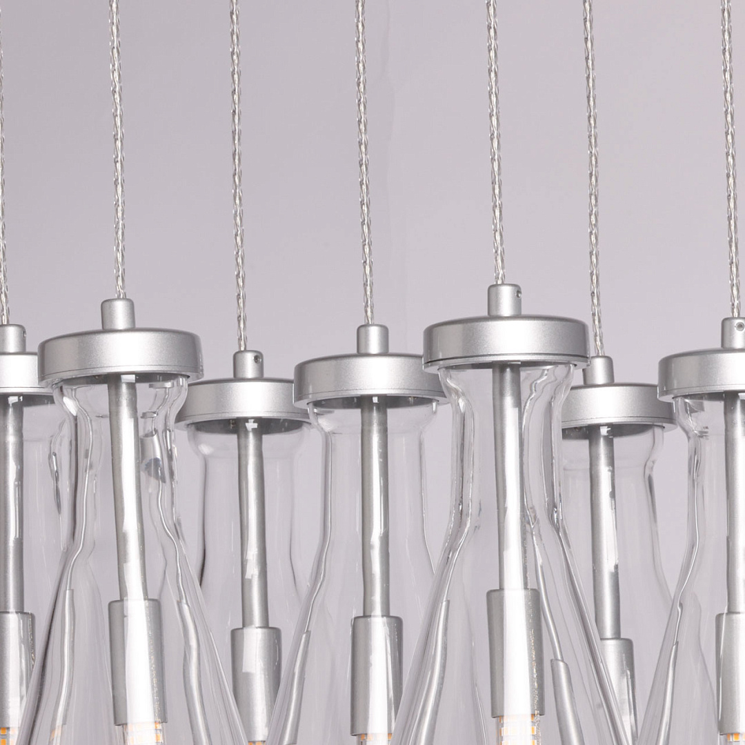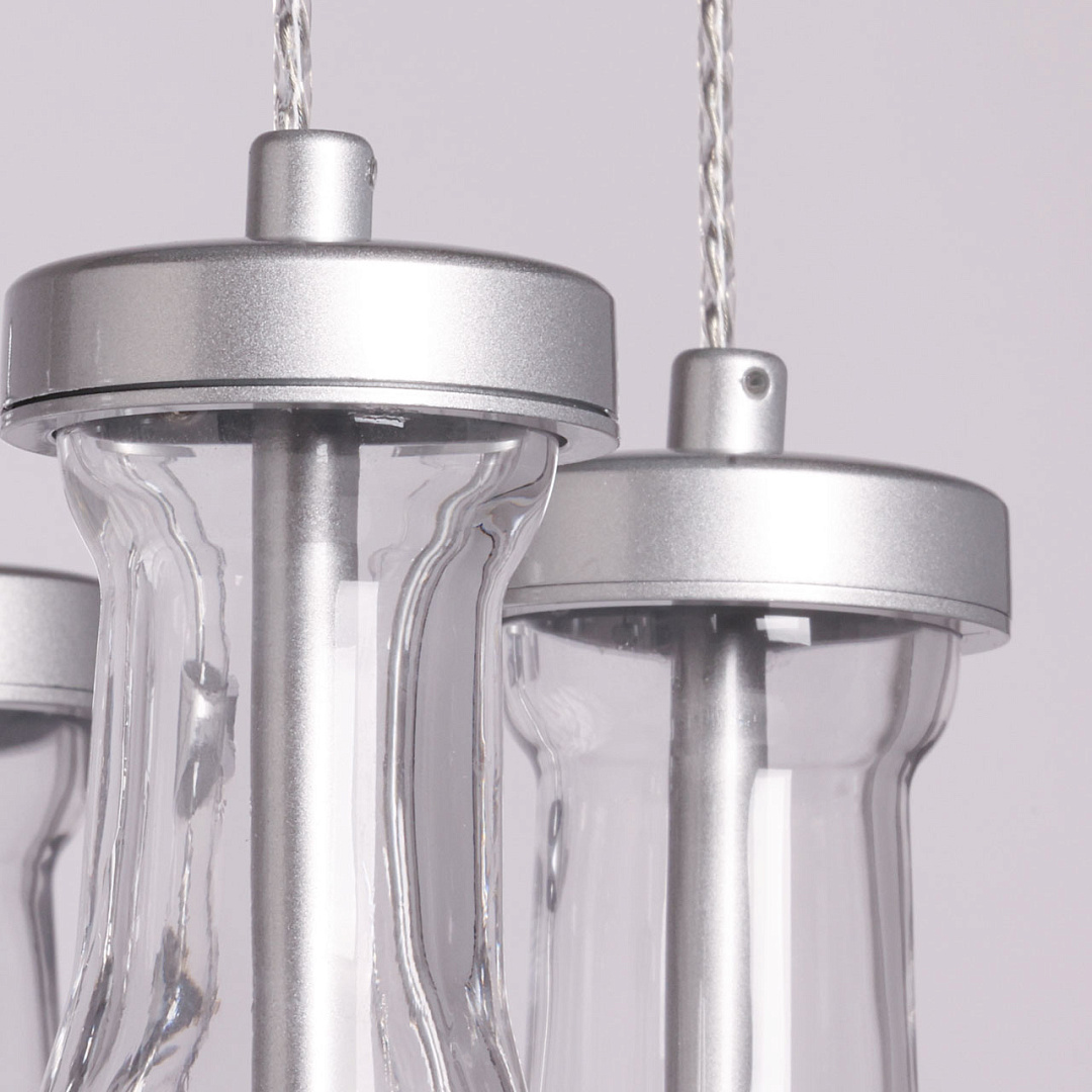 Стильный матовый серебряный цвет добавляет изысканности и элегантности. Светильник привлекает внимание оригинальной формой стеклянных плафонов. Прозрачный цвет позволяет свету проникать через плафоны, создавая уникальные оттенки игры света. Возможность регулировать комфортную высоту. Заменяемые источники света удобны в эксплуатации.