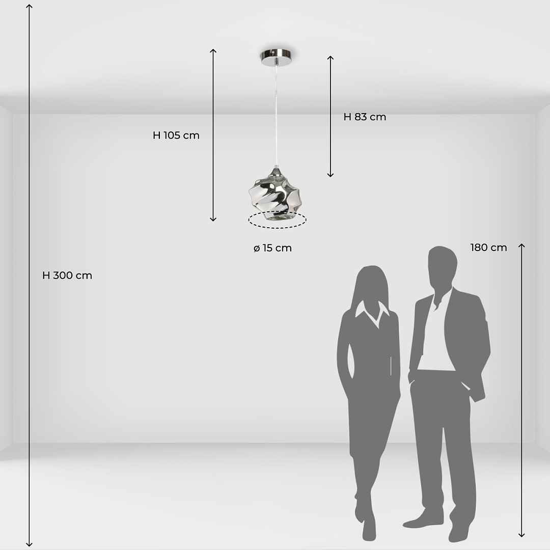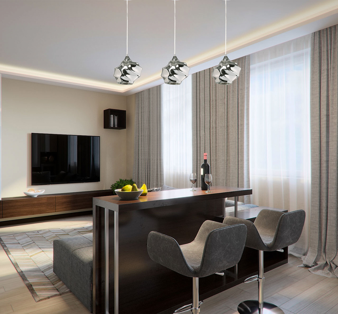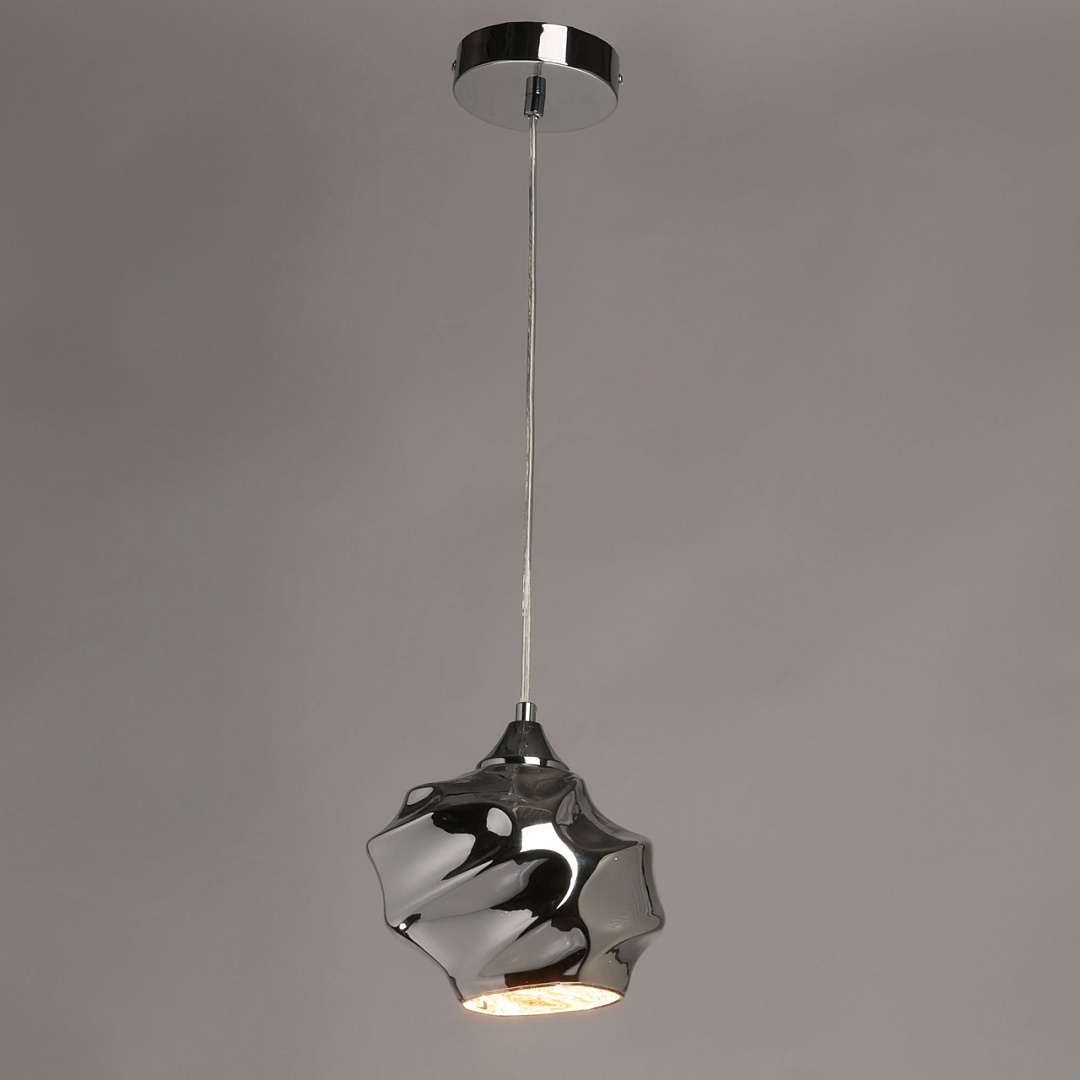 Одиночный подвес создает комфортное местное освещение. Плафон из стекла цвета хрома оригинальной формы привлекает к себе внимание. Заменяемые источники света удобны в эксплуатации. Возможность устанавливать комфортную высоту.