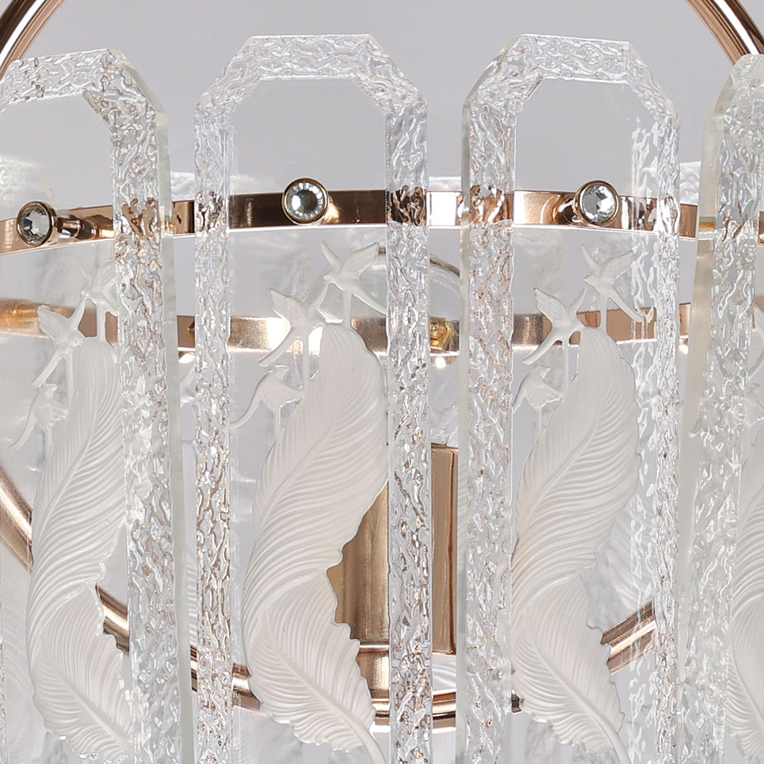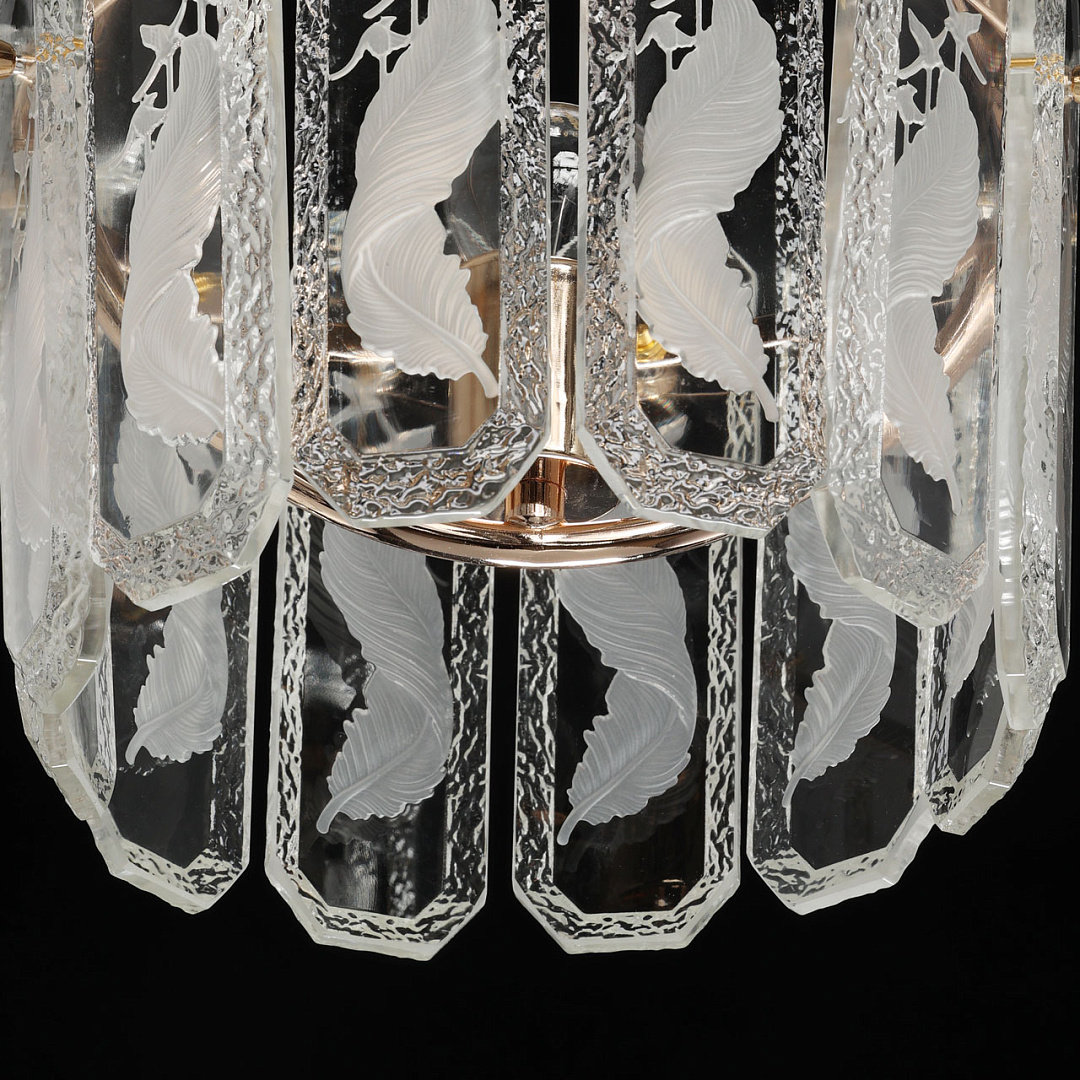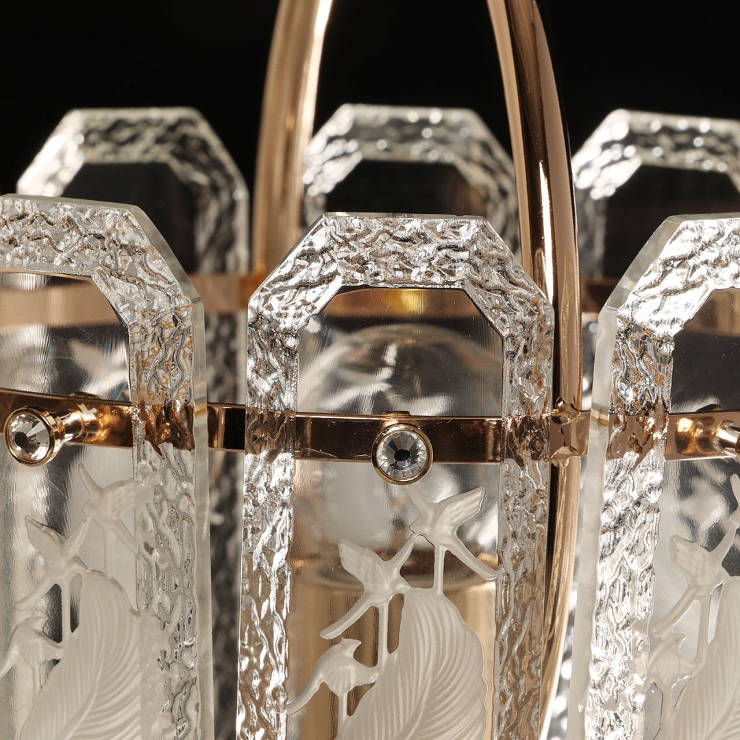 Подвесная люстра привлекает внимание необычным дизайном, добавляя индивидуальности интерьеру. Современный классический цвет золота гармонично дополняется дизайном в стиле лофт. Фактура прозрачного вулканического стекла с растительным декором  разбивает световой поток на множество ярких бликов, которые создают в комнате романтичную атмосферу. Возможность регулировать комфортную высоту. Заменяемые источники света удобны в эксплуатации.