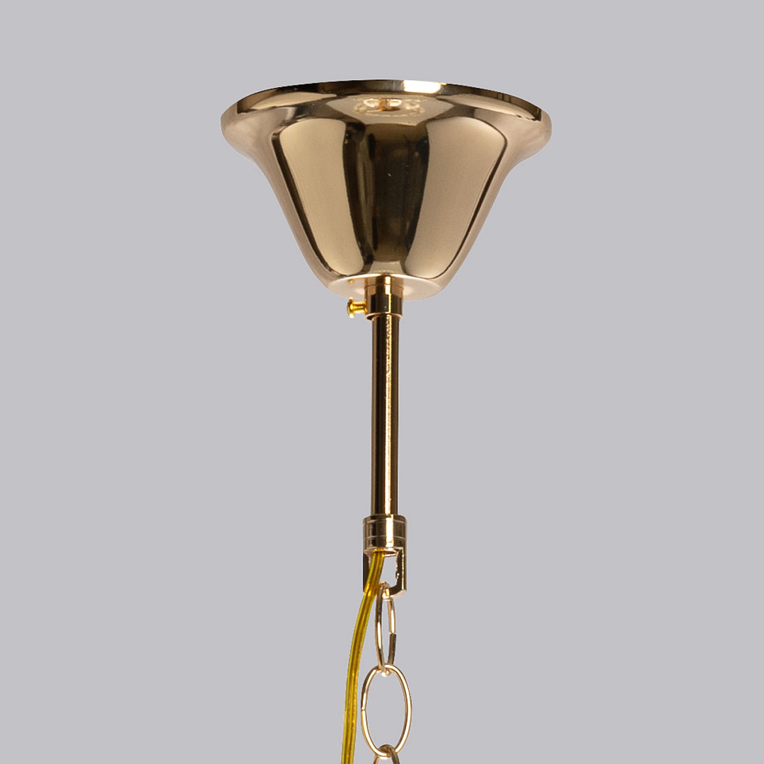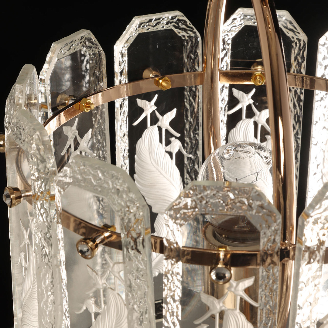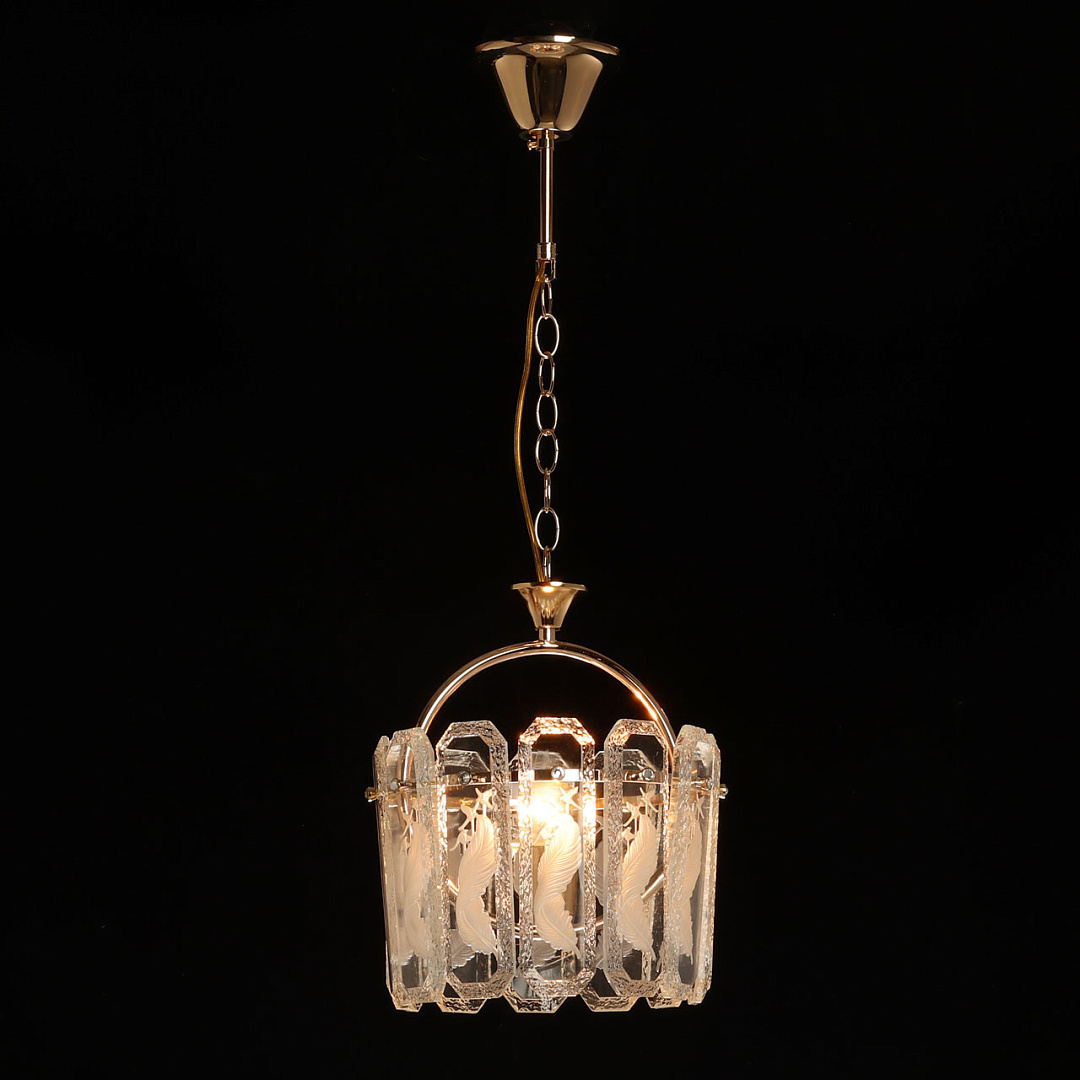 Подвесная люстра привлекает внимание необычным дизайном, добавляя индивидуальности интерьеру. Современный классический цвет золота гармонично дополняется дизайном в стиле лофт. Фактура прозрачного вулканического стекла с растительным декором  разбивает световой поток на множество ярких бликов, которые создают в комнате романтичную атмосферу. Возможность регулировать комфортную высоту. Заменяемые источники света удобны в эксплуатации.