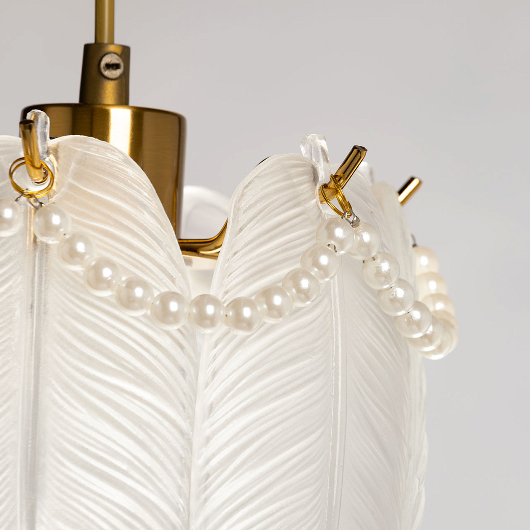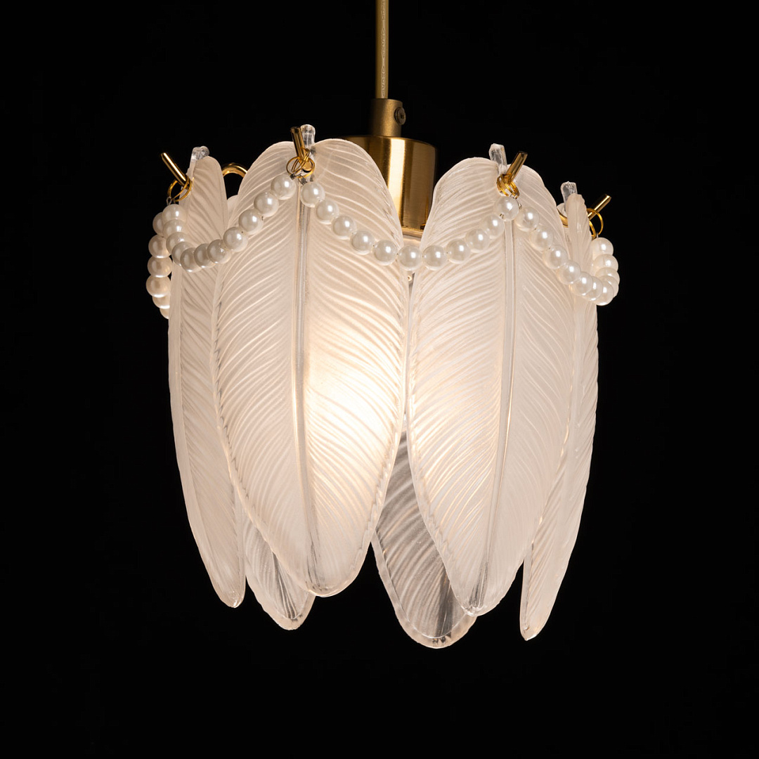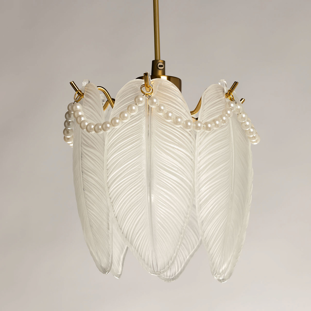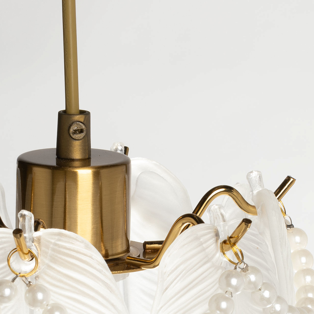 Цвет французского золота придает подвесной люстре элегантности. Стеклянные листья тонкой работы соответствуют тренду природности. Матированный декор из стекла создает мягкий и уютный свет. Декор, имитирующий жемчужные бусы, вносит нотки шарма и изящества. Возможность регулировать комфортную высоту. Заменяемые источники света удобны в эксплуатации.