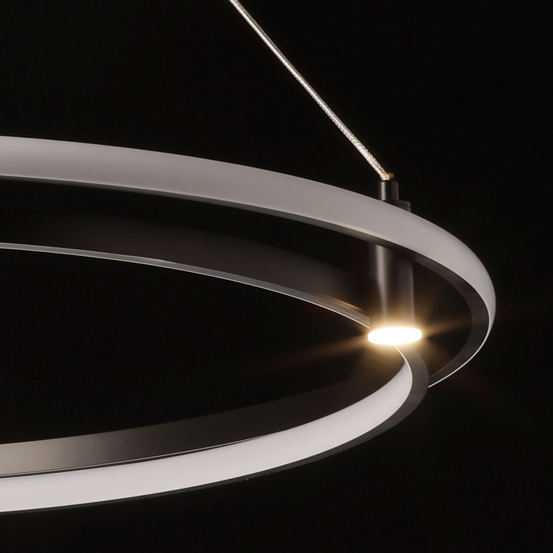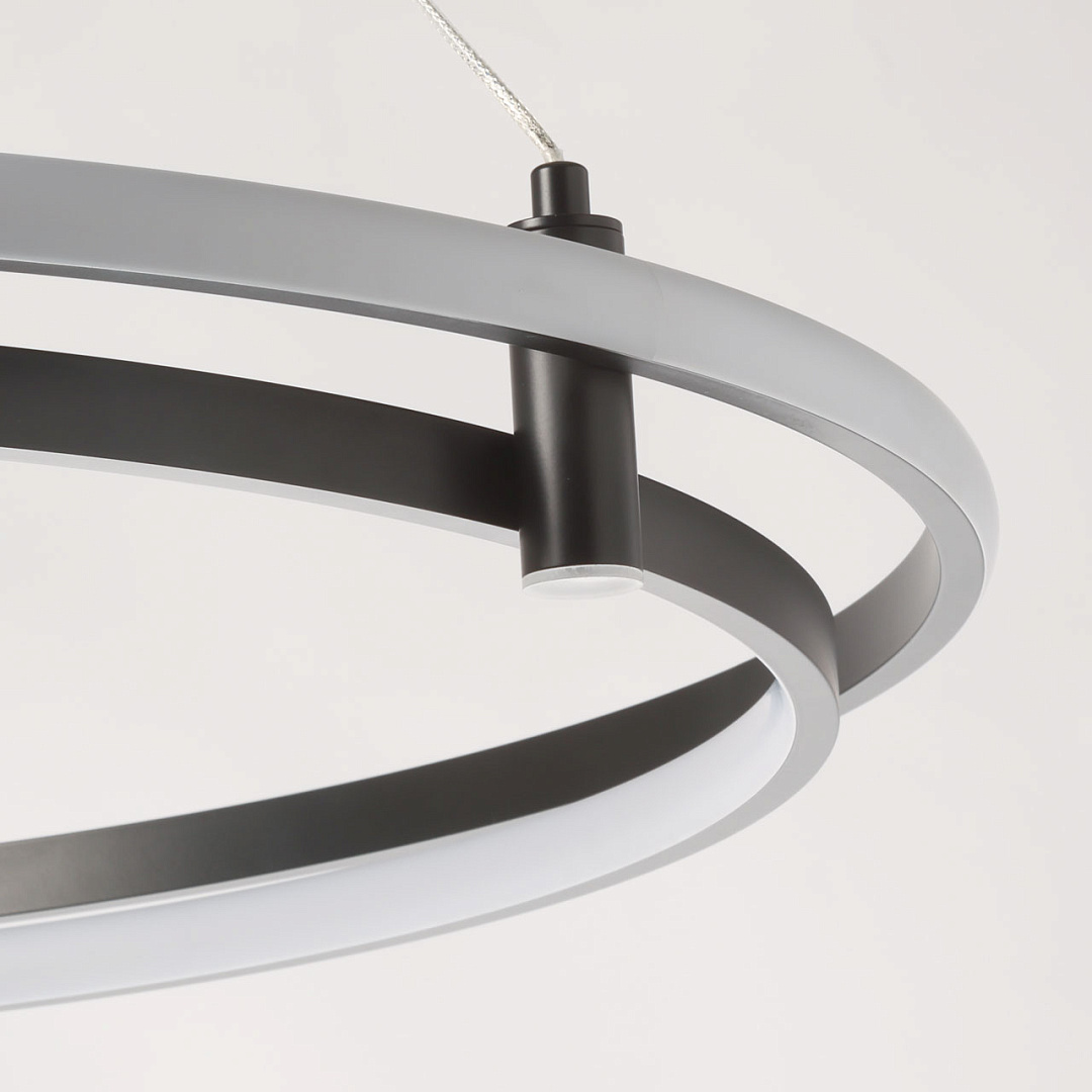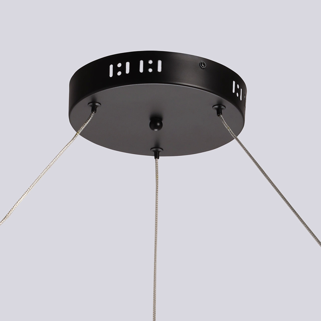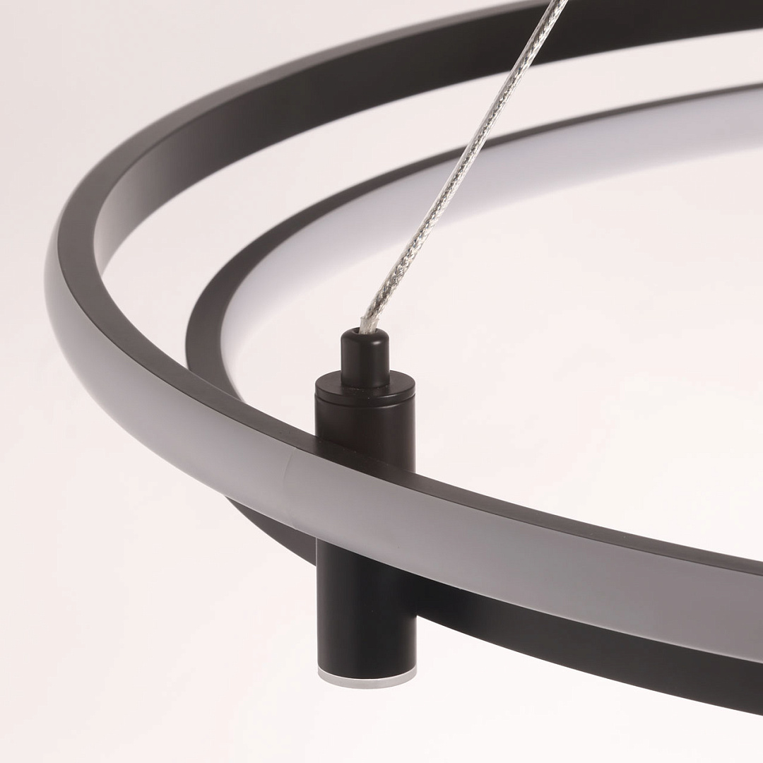 Сочетание геометричной формы и черного цвета актуально для современных интерьеров в стиле хай-тек и лофт. Три режима диммирования: свет в кольцах, свет в спотах и общее включение позволяют регулировать интенсивность освещения всего пространства комнаты. Наличие пульта делает удобным управление функциями светильника.  Светодиодные источники света безопасны и экономичны. Возможность регулировать комфортную высоту.