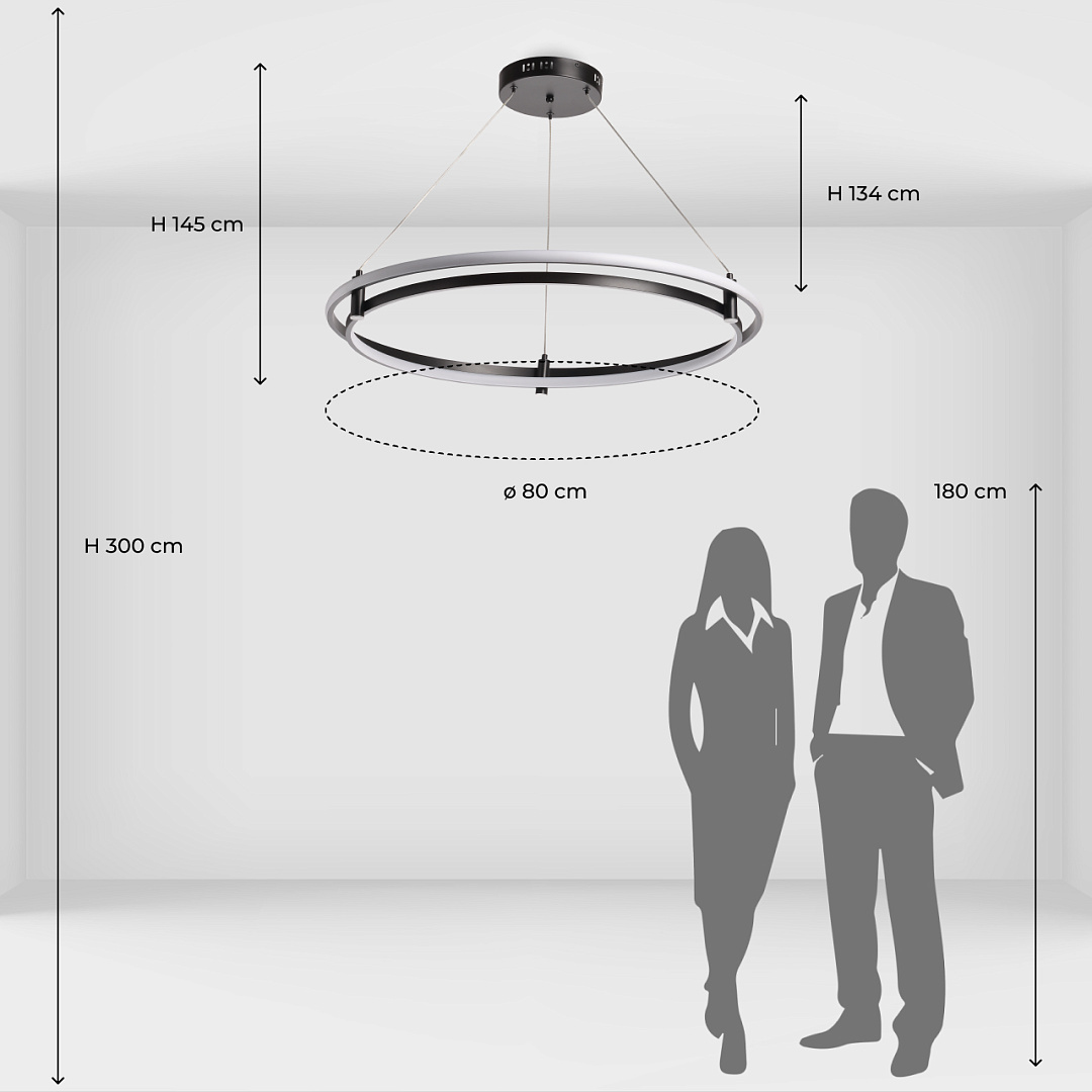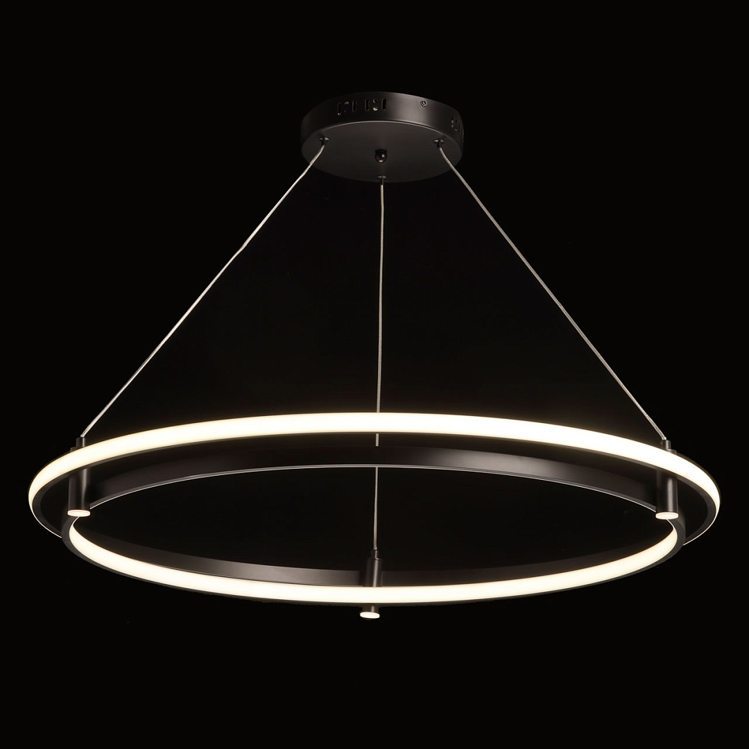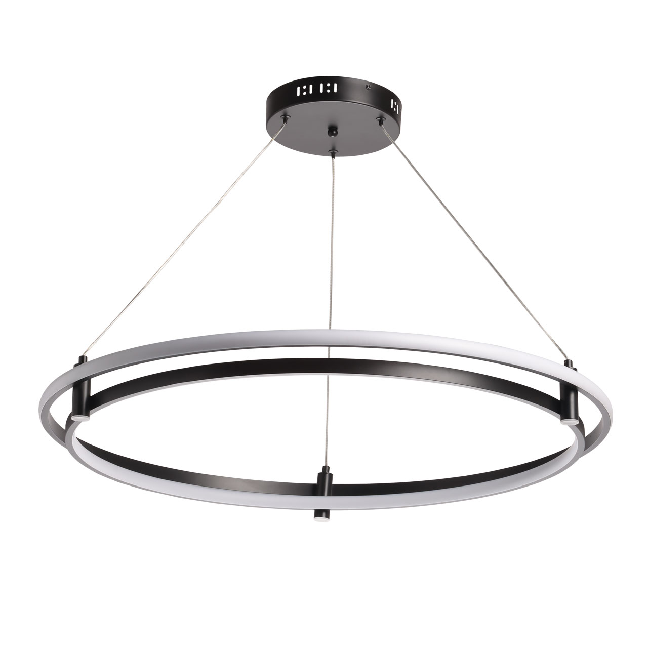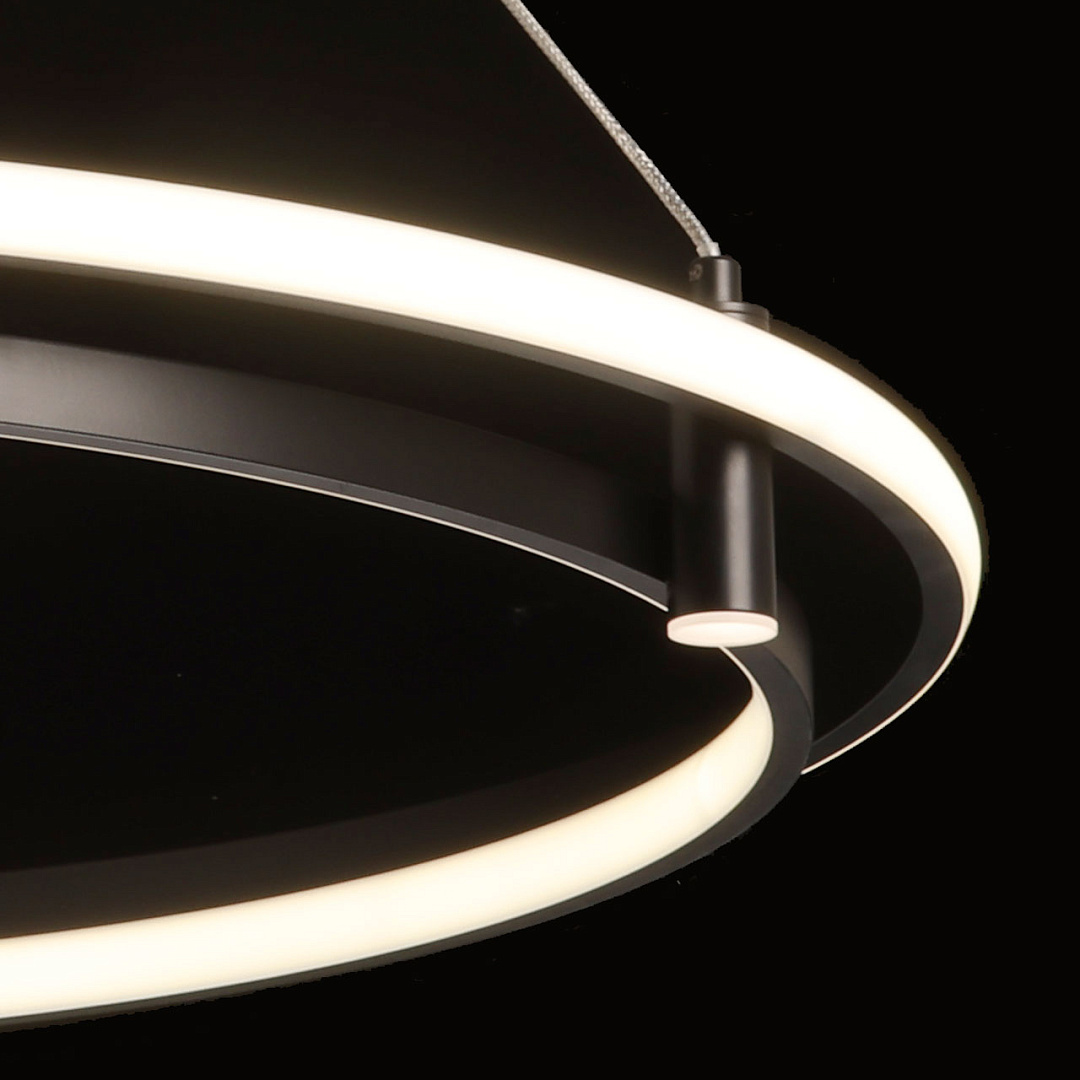 Сочетание геометричной формы и черного цвета актуально для современных интерьеров в стиле хай-тек и лофт. Три режима диммирования: свет в кольцах, свет в спотах и общее включение позволяют регулировать интенсивность освещения всего пространства комнаты. Наличие пульта делает удобным управление функциями светильника.  Светодиодные источники света безопасны и экономичны. Возможность регулировать комфортную высоту.